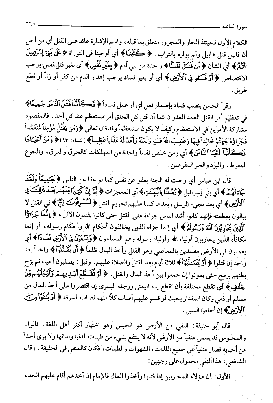 قال ابن عباس أي وجبت له الجنة بعفو عن نفس كما لو عفا عن الناس جَمِيعاً وَلَقَدْ جاءَتْهُمْ أي بني إسرائيل رُسُلُنا بِالْبَيِّناتِ أي المعجزات ثُمَّ إِنَّ كَثِيراً مِنْهُمْ بَعْدَ ذلِكَ فِي الْأَرْضِ أي بعد مجيء الرسل وبعد ما كتبنا عليهم تحريم القتل لَمُسْرِفُونَ (32) في القتل لا يبالون بعظمته فإنهم كانوا أشد الناس جراءة على القتل حتى كانوا يقتلون الأنبياء إِنَّما جَزاءُ الَّذِينَ يُحارِبُونَ اللَّهَ وَرَسُولَهُ أي إنما جزاء الذين يخالفون أحكام الله وأحكام رسوله، أو إنما مكافأة الذين يحاربون أولياء الله وأولياء رسوله وهم المسلمون وَيَسْعَوْنَ فِي الْأَرْضِ فَساداً أي يعملون في الأرض مفسدين بالمعاصي وهو القتل وأخذ المال ظلما أَنْ يُقَتَّلُوا واحدا بعد واحد إن قتلوا أَوْ يُصَلَّبُوا ثلاثة أيام بعد القتل والصلاة عليهم. وقيل: يصلبون أحياء ثم يزج بطنهم برمح حتى يموتوا إن جمعوا بين أخذ المال والقتل. أَوْ تُقَطَّعَ أَيْدِيهِمْ وَأَرْجُلُهُمْ مِنْ خِلافٍ أي تقطع مختلفة بأن تقطع يده اليمنى ورجله اليسرى إن اقتصروا على أخذ المال من مسلم أو ذمي وكان المقدار بحيث لو قسم عليهم أصاب كلا منهم نصاب السرقة أَوْ يُنْفَوْا مِنَ الْأَرْضِ إن أخافوا السبل.