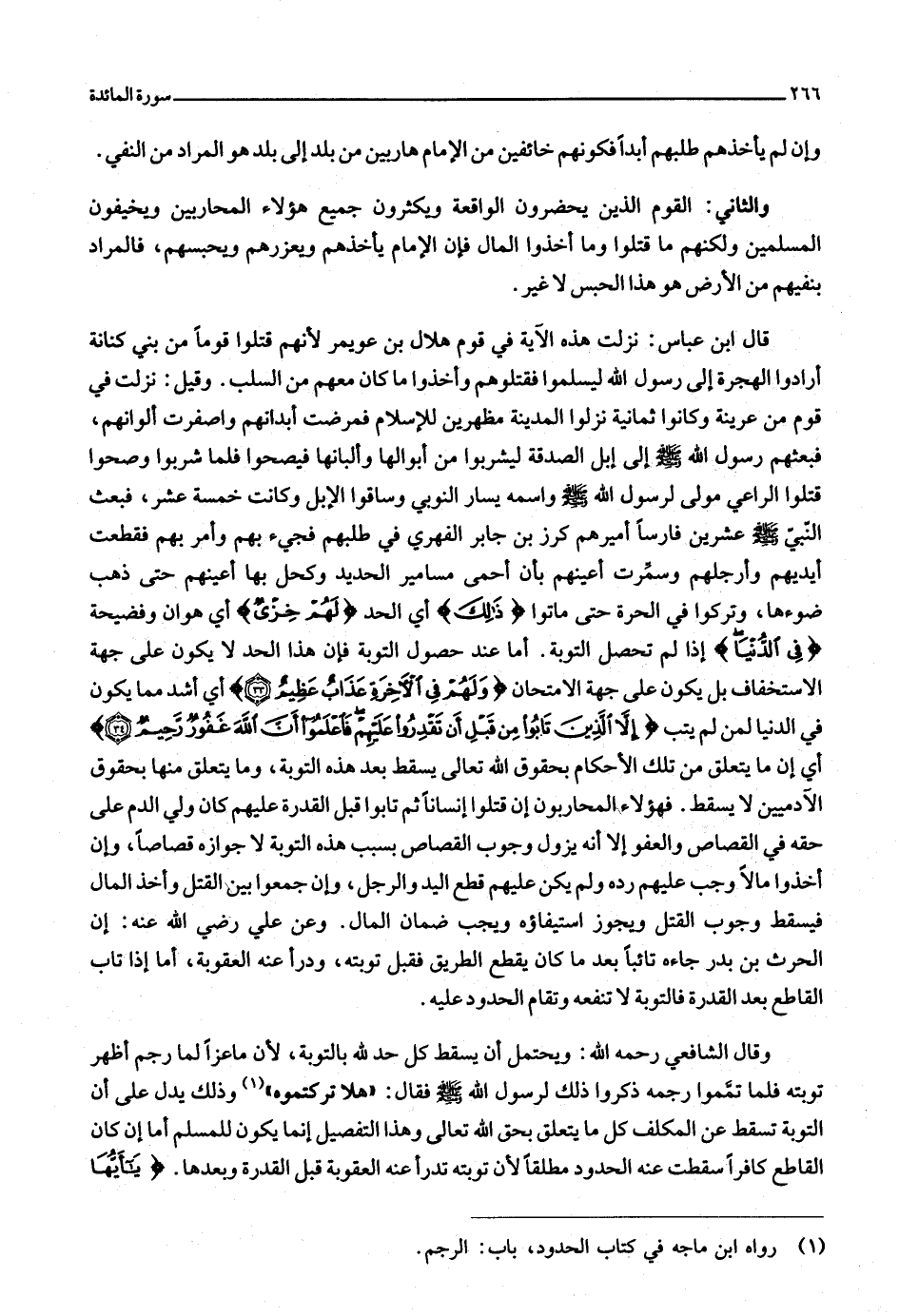 «1» وذلك يدل على أن التوبة تسقط عن المكلف كل ما يتعلق بحق الله تعالى وهذا التفصيل إنما يكون للمسلم أما إن كان القاطع كافرا سقطت عنه الحدود مطلقا لأن توبته تدرأ عنه العقوبة قبل القدرة وبعدها.