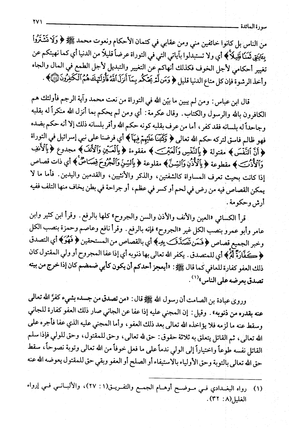 قال ابن عباس: ومن لم يبين ما بيّن الله في التوراة من نعت محمد وآية الرجم فأولئك هم الكافرون بالله والرسول والكتاب. وقال عكرمة: أي ومن لم يحكم بما أنزل الله منكرا له بقلبه وجاحدا له بلسانه فقد كفر، أما من عرف بقلبه كونه حكم الله وأقر بلسانه ذلك إلا أنه حكم بضده فهو ظالم فاسق لتركه حكم الله تعالى وَكَتَبْنا عَلَيْهِمْ فِيها أي فرضنا على نبي إسرائيل في التوراة أَنَّ النَّفْسَ مقتولة بِالنَّفْسِ وَالْعَيْنَ مفقوءة بِالْعَيْنِ وَالْأَنْفَ مجدوع بِالْأَنْفِ وَالْأُذُنَ مقطوعة بِالْأُذُنِ وَالسِّنَّ مقلوعة بِالسِّنِّ وَالْجُرُوحَ قِصاصٌ أي ذات قصاص إذا كانت بحيث تعرف المساواة كالشفتين، والذكر والأنثيين، والقدمين واليدين. فأما ما لا يمكن القصاص فيه من رض في لحم أو كسر في عظم، أو جراحة في بطن يخاف منها التلف ففيه أرش وحكومة.