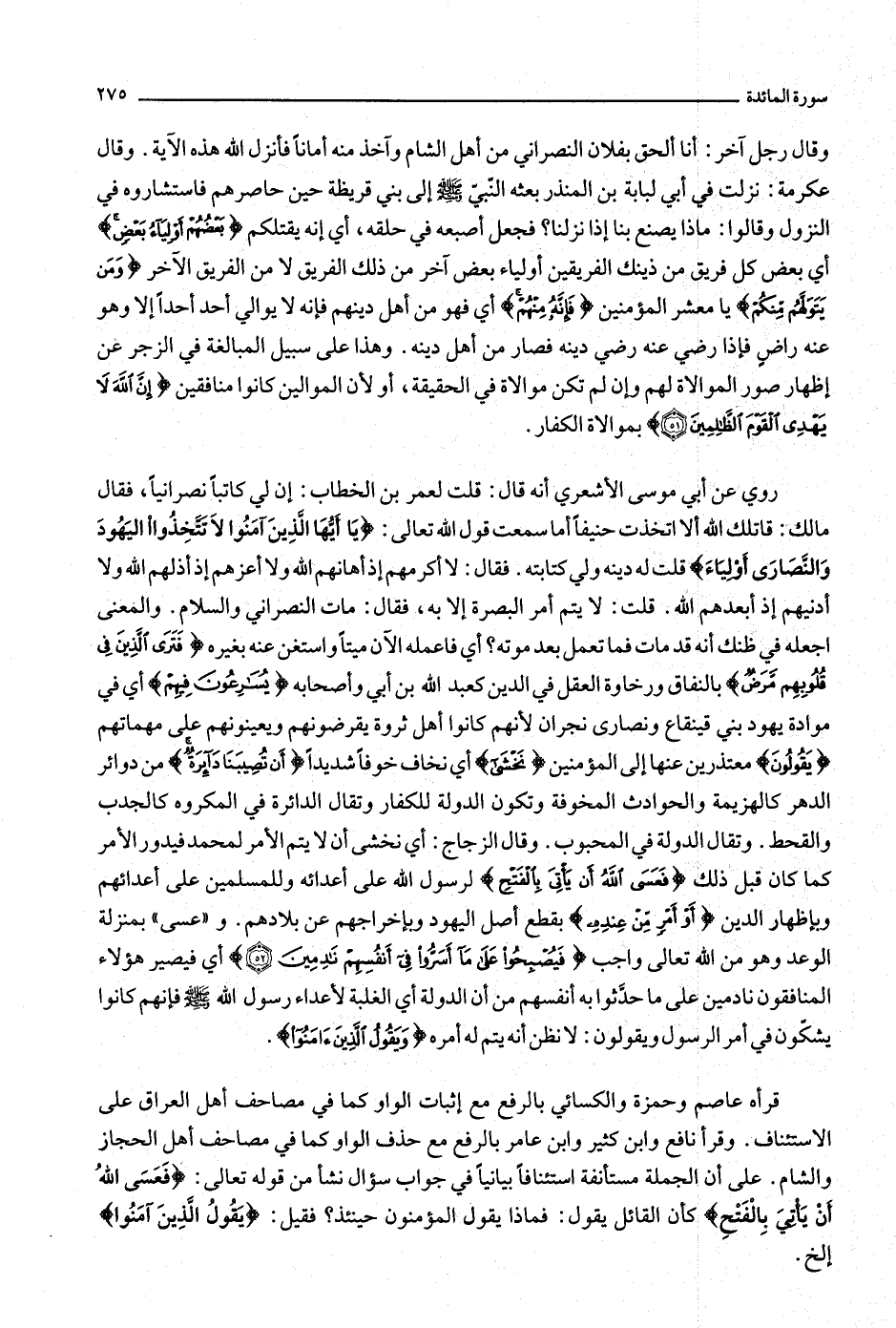 روي عن أبي موسى الأشعري أنه قال: قلت لعمر بن الخطاب: إن لي كاتبا نصرانيا، فقال مالك: قاتلك الله ألا اتخذت حنيفا أما سمعت قول الله تعالى: يا أَيُّهَا الَّذِينَ آمَنُوا لا تَتَّخِذُوا الْيَهُودَ وَالنَّصارى أَوْلِياءَ قلت له دينه ولي كتابته. فقال: لا أكرمهم إذ أهانهم الله ولا أعزهم إذ أذلهم الله ولا أدنيهم إذ أبعدهم الله. قلت: لا يتم أمر البصرة إلا به، فقال: مات النصراني والسلام. والمعنى اجعله في ظنك أنه قد مات فما تعمل بعد موته؟ أي فاعمله الآن ميتا واستغن عنه بغيره فَتَرَى الَّذِينَ فِي قُلُوبِهِمْ مَرَضٌ بالنفاق ورخاوة العقل في الدين كعبد الله بن أبي وأصحابه يُسارِعُونَ فِيهِمْ أي في موادة يهود بني قينقاع ونصارى نجران لأنهم كانوا أهل ثروة يقرضونهم ويعينونهم على مهماتهم يَقُولُونَ معتذرين عنها إلى المؤمنين نَخْشى أي نخاف خوفا شديدا أَنْ تُصِيبَنا دائِرَةٌ من دوائر الدهر كالهزيمة والحوادث المخوفة وتكون الدولة للكفار وتقال الدائرة في المكروه كالجدب والقحط. وتقال الدولة في المحبوب. وقال الزجاج: أي نخشى أن لا يتم الأمر لمحمد فيدور الأمر كما كان قبل ذلك فَعَسَى اللَّهُ أَنْ يَأْتِيَ بِالْفَتْحِ لرسول الله على أعدائه وللمسلمين على أعدائهم وبإظهار الدين أَوْ أَمْرٍ مِنْ عِنْدِهِ بقطع أصل اليهود وبإخراجهم عن بلادهم. و «عسى» بمنزلة الوعد وهو من الله تعالى واجب فَيُصْبِحُوا عَلى ما أَسَرُّوا فِي أَنْفُسِهِمْ نادِمِينَ (52) أي فيصير هؤلاء المنافقون نادمين على ما حدّثوا به أنفسهم من أن الدولة أي الغلبة لأعداء رسول الله صلّى الله عليه وسلّم فإنهم كانوا يشكّون في أمر الرسول ويقولون: لا نظن أنه يتم له أمره وَيَقُولُ الَّذِينَ آمَنُوا.