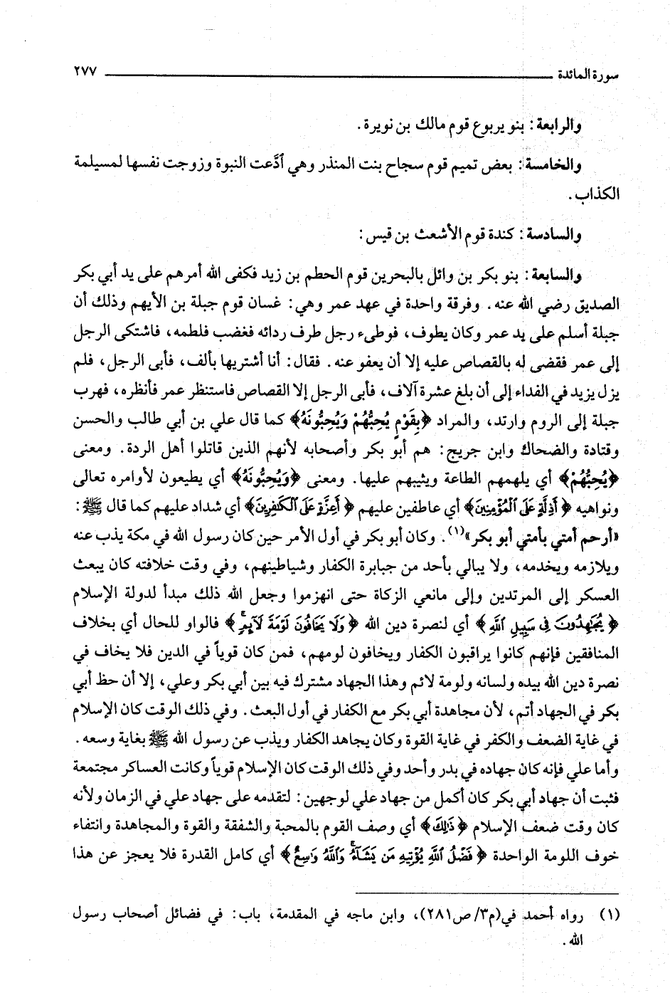 والسابعة: بنو بكر بن وائل بالبحرين قوم الحطم بن زيد فكفى الله أمرهم على يد أبي بكر الصديق رضي الله عنه. وفرقة واحدة في عهد عمر وهي: غسان قوم جبلة بن الأيهم وذلك أن جبلة أسلم على يد عمر وكان يطوف، فوطئ رجل طرف ردائه فغضب فلطمه، فاشتكى الرجل إلى عمر فقضى له بالقصاص عليه إلا أن يعفو عنه. فقال: أنا أشتريها بألف، فأبى الرجل، فلم يزل يزيد في الفداء إلى أن بلغ عشرة آلاف، فأبى الرجل إلا القصاص فاستنظر عمر فأنظره، فهرب جبلة إلى الروم وارتد، والمراد بِقَوْمٍ يُحِبُّهُمْ وَيُحِبُّونَهُ كما قال علي بن أبي طالب والحسن وقتادة والضحاك وابن جريج: هم أبو بكر وأصحابه لأنهم الذين قاتلوا أهل الردة. ومعنى يُحِبُّهُمْ أي يلهمهم الطاعة ويثيبهم عليها. ومعنى وَيُحِبُّونَهُ أي يطيعون لأوامره تعالى ونواهيه أَذِلَّةٍ عَلَى الْمُؤْمِنِينَ أي عاطفين عليهم أَعِزَّةٍ عَلَى الْكافِرِينَ أي شداد عليهم كما