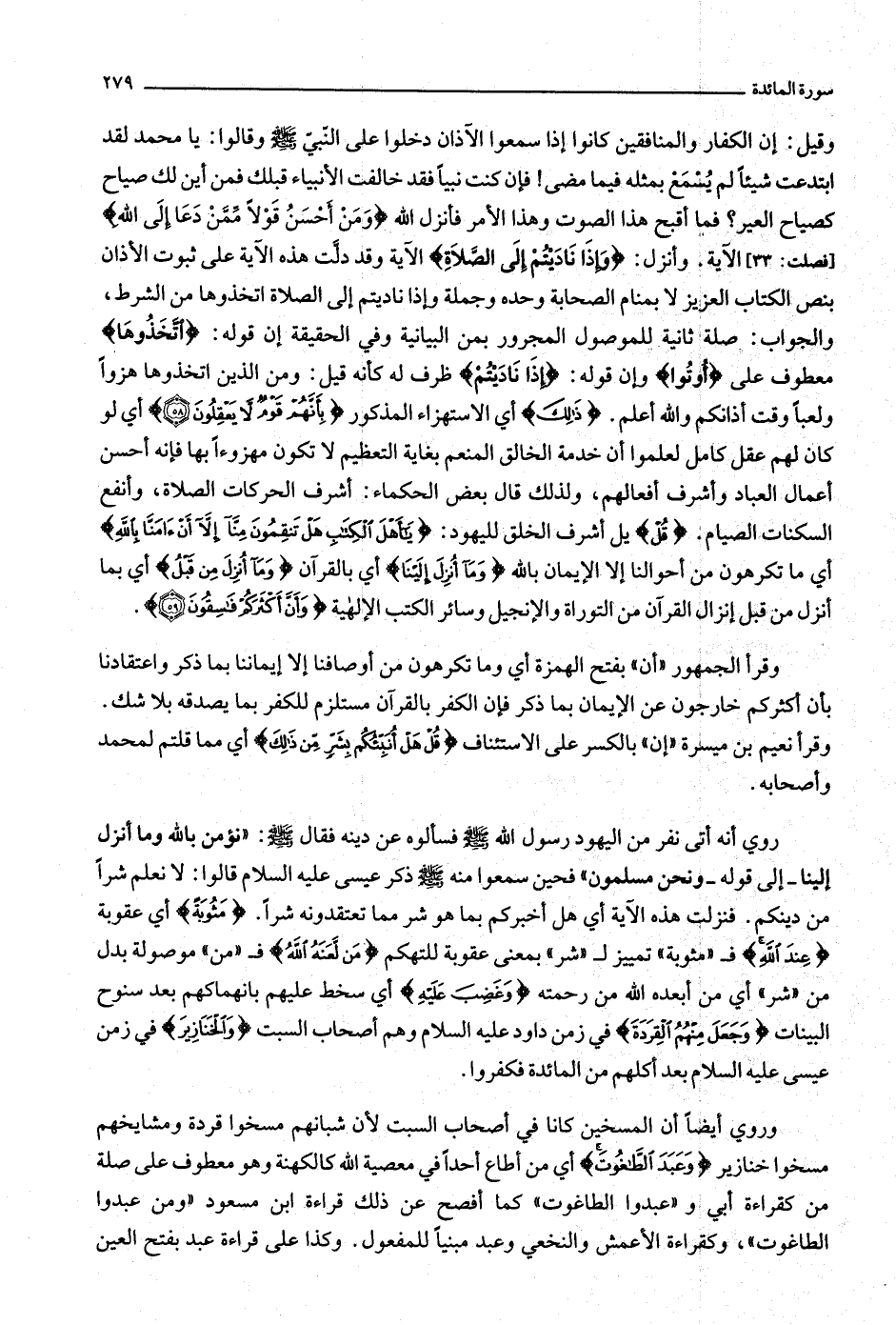 وقيل: إن الكفار والمنافقين كانوا إذا سمعوا الآذان دخلوا على النّبيّ صلّى الله عليه وسلّم وقالوا: يا محمد لقد ابتدعت شيئا لم يسمع بمثله فيما مضى! فإن كنت نبيا فقد خالفت الأنبياء قبلك فمن أين لك صياح كصياح العير؟ فما أقبح هذا الصوت وهذا الأمر فأنزل الله وَمَنْ أَحْسَنُ قَوْلًا مِمَّنْ دَعا إِلَى اللَّهِ [فصلت: 33] الآية. وأنزل: وَإِذا نادَيْتُمْ إِلَى الصَّلاةِ الآية وقد دلّت هذه الآية على ثبوت الأذان بنص الكتاب العزيز لا بمنام الصحابة وحده وجملة وإذا ناديتم إلى الصلاة اتخذوها من الشرط، والجواب: صلة ثانية للموصول المجرور بمن البيانية وفي الحقيقة إن قوله: اتَّخَذُوها معطوف على أُوتُوا وإن قوله: إِذا نادَيْتُمْ ظرف له كأنه قيل: ومن الذين اتخذوها هزوا ولعبا وقت أذانكم والله أعلم. ذلِكَ أي الاستهزاء المذكور بِأَنَّهُمْ قَوْمٌ لا يَعْقِلُونَ (58) أي لو كان لهم عقل كامل لعلموا أن خدمة الخالق المنعم بغاية التعظيم لا تكون مهزوءا بها فإنه أحسن أعمال العباد وأشرف أفعالهم، ولذلك قال بعض الحكماء: أشرف الحركات الصلاة، وأنفع السكنات الصيام. قُلْ بل أشرف الخلق لليهود: يا أَهْلَ الْكِتابِ هَلْ تَنْقِمُونَ مِنَّا إِلَّا أَنْ آمَنَّا بِاللَّهِ أي ما تكرهون من أحوالنا إلا الإيمان بالله وَما أُنْزِلَ إِلَيْنا أي بالقرآن وَما أُنْزِلَ مِنْ قَبْلُ أي بما أنزل من قبل إنزال القرآن من التوراة والإنجيل وسائر الكتب الإلهية وَأَنَّ أَكْثَرَكُمْ فاسِقُونَ (59) .