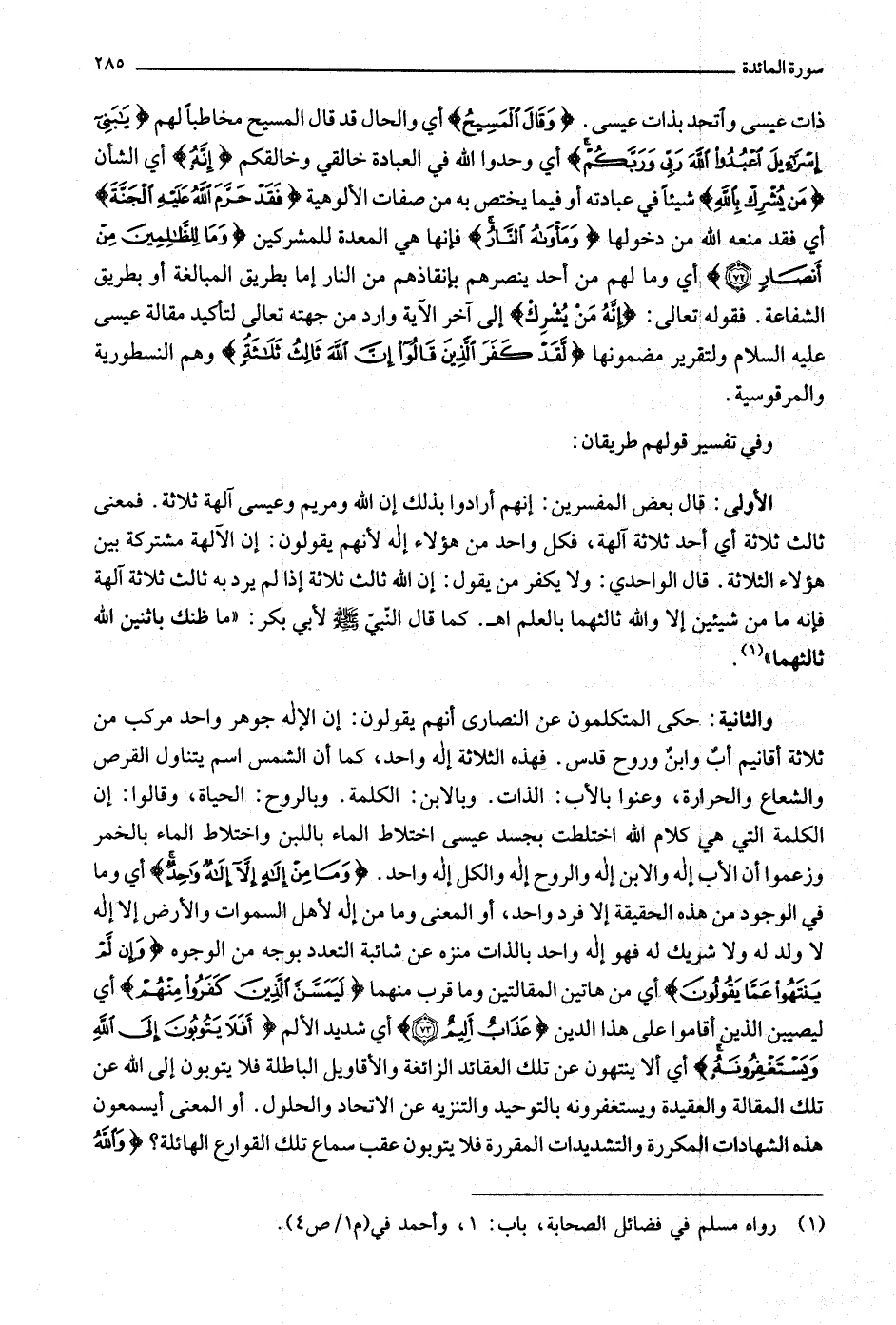 ذات عيسى واتحد بذات عيسى. وَقالَ الْمَسِيحُ أي والحال قد قال المسيح مخاطبا لهم يا بَنِي إِسْرائِيلَ اعْبُدُوا اللَّهَ رَبِّي وَرَبَّكُمْ أي وحدوا الله في العبادة خالقي وخالقكم إِنَّهُ أي الشأن مَنْ يُشْرِكْ بِاللَّهِ شيئا في عبادته أو فيما يختص به من صفات الألوهية فَقَدْ حَرَّمَ اللَّهُ عَلَيْهِ الْجَنَّةَ أي فقد منعه الله من دخولها وَمَأْواهُ النَّارُ فإنها هي المعدة للمشركين وَما لِلظَّالِمِينَ مِنْ أَنْصارٍ (72) أي وما لهم من أحد ينصرهم بإنقاذهم من النار إما بطريق المبالغة أو بطريق الشفاعة. فقوله تعالى: إِنَّهُ مَنْ يُشْرِكْ إلى آخر الآية وارد من جهته تعالى لتأكيد مقالة عيسى عليه السلام ولتقرير مضمونها لَقَدْ كَفَرَ الَّذِينَ قالُوا إِنَّ اللَّهَ ثالِثُ ثَلاثَةٍ وهم النسطورية والمرقوسية.