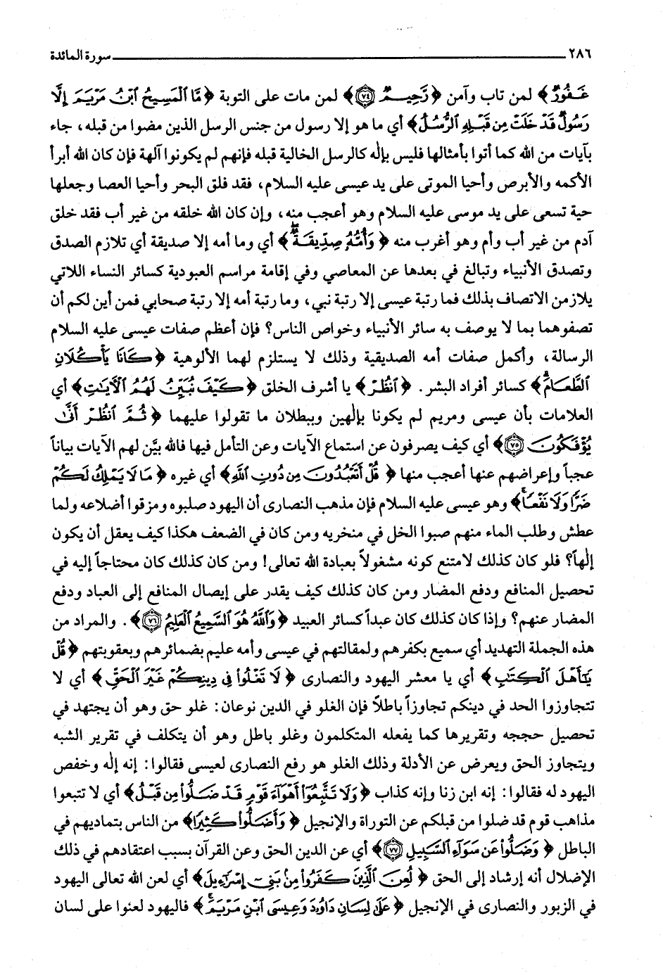لمن تاب وآمن رَحِيمٌ (74) لمن مات على التوبة مَا الْمَسِيحُ ابْنُ مَرْيَمَ إِلَّا رَسُولٌ قَدْ خَلَتْ مِنْ قَبْلِهِ الرُّسُلُ أي ما هو إلا رسول من جنس الرسل الذين مضوا من قبله، جاء بآيات من الله كما أتوا بأمثالها فليس بإله كالرسل الخالية قبله فإنهم لم يكونوا آلهة فإن كان الله أبرأ الأكمه والأبرص وأحيا الموتى على يد عيسى عليه السلام، فقد فلق البحر وأحيا العصا وجعلها حية تسعى على يد موسى عليه السلام وهو أعجب منه، وإن كان الله خلقه من غير أب فقد خلق آدم من غير أب وأم وهو أغرب منه وَأُمُّهُ صِدِّيقَةٌ أي وما أمه إلا صديقة أي تلازم الصدق وتصدق الأنبياء وتبالغ في بعدها عن المعاصي وفي إقامة مراسم العبودية كسائر النساء اللاتي يلازمن الاتصاف بذلك فما رتبة عيسى إلا رتبة نبي، وما رتبة أمه إلا رتبة صحابي فمن أين لكم أن تصفوهما بما لا يوصف به سائر الأنبياء وخواص الناس؟ فإن أعظم صفات عيسى عليه السلام الرسالة، وأكمل صفات أمه الصديقية وذلك لا يستلزم لهما الألوهية كانا يَأْكُلانِ الطَّعامَ كسائر أفراد البشر. انْظُرْ يا أشرف الخلق كَيْفَ نُبَيِّنُ لَهُمُ الْآياتِ أي