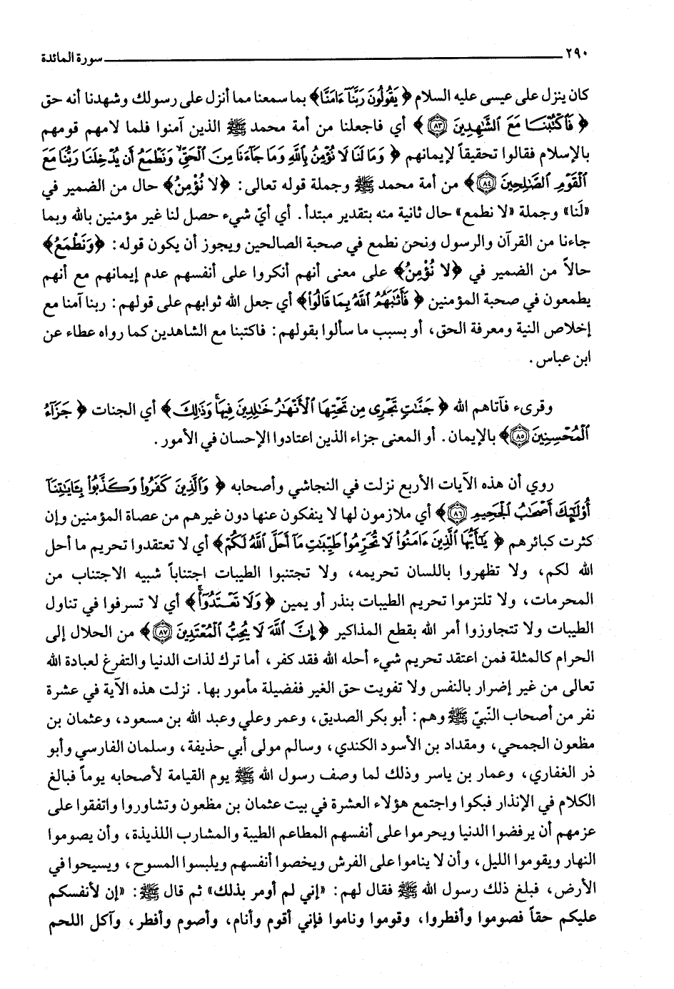 روي أن هذه الآيات الأربع نزلت في النجاشي وأصحابه وَالَّذِينَ كَفَرُوا وَكَذَّبُوا بِآياتِنا أُولئِكَ أَصْحابُ الْجَحِيمِ (86) أي ملازمون لها لا ينفكون عنها دون غيرهم من عصاة المؤمنين وإن كثرت كبائرهم يا أَيُّهَا الَّذِينَ آمَنُوا لا تُحَرِّمُوا طَيِّباتِ ما أَحَلَّ اللَّهُ لَكُمْ أي لا تعتقدوا تحريم ما أحل الله لكم، ولا تظهروا باللسان تحريمه، ولا تجتنبوا الطيبات اجتنابا شبيه الاجتناب من المحرمات، ولا تلتزموا تحريم الطيبات بنذر أو يمين وَلا تَعْتَدُوا أي لا تسرفوا في تناول الطيبات ولا تتجاوزوا أمر الله بقطع المذاكير إِنَّ اللَّهَ لا يُحِبُّ الْمُعْتَدِينَ (87) من الحلال إلى الحرام كالمثلة فمن اعتقد تحريم شيء أحله الله فقد كفر، أما ترك لذات الدنيا والتفرغ لعبادة الله تعالى من غير إضرار بالنفس ولا تفويت حق الغير ففضيلة مأمور بها. نزلت هذه الآية في عشرة نفر من أصحاب النّبيّ صلّى الله عليه وسلّم وهم: أبو بكر الصديق، وعمر وعلي وعبد الله بن مسعود، وعثمان بن مظعون الجمحي، ومقداد بن الأسود الكندي، وسالم مولى أبي حذيفة، وسلمان الفارسي وأبو ذر الغفاري، وعمار بن ياسر وذلك لما وصف رسول الله صلّى الله عليه وسلّم يوم القيامة لأصحابه يوما فبالغ الكلام في الإنذار فبكوا واجتمع هؤلاء العشرة في بيت عثمان بن مظعون وتشاوروا واتفقوا على عزمهم أن يرفضوا الدنيا ويحرموا على أنفسهم المطاعم الطيبة والمشارب اللذيذة، وأن يصوموا النهار ويقوموا الليل، وأن لا يناموا على الفرش ويخصوا أنفسهم ويلبسوا المسوح، ويسيحوا في الأرض، فبلغ ذلك رسول الله صلّى الله عليه وسلّم