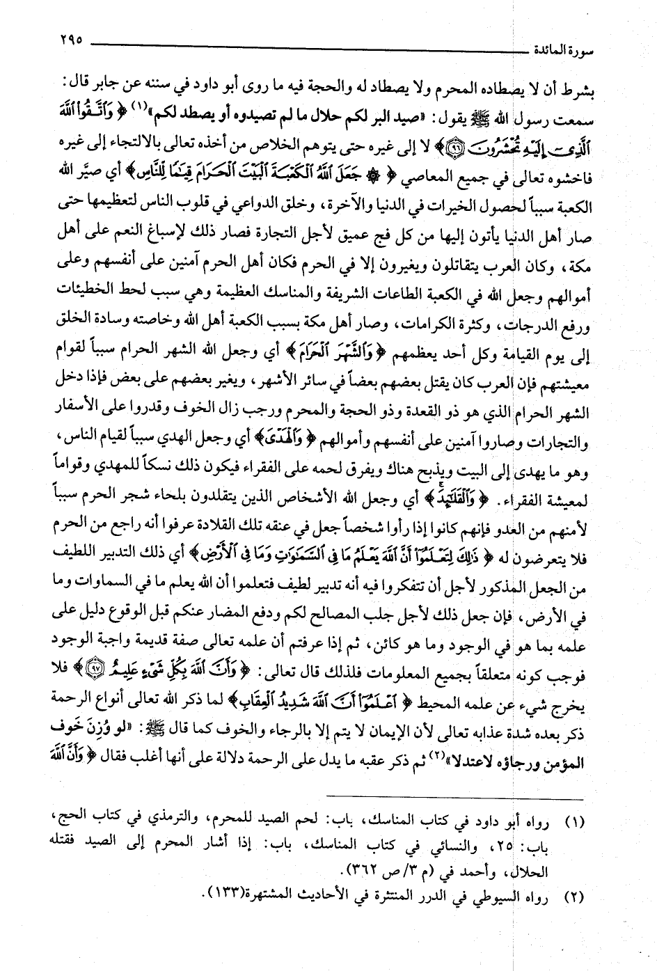 «1» وَاتَّقُوا اللَّهَ الَّذِي إِلَيْهِ تُحْشَرُونَ (96) لا إلى غيره حتى يتوهم الخلاص من أخذه تعالى بالالتجاء إلى غيره فاخشوه تعالى في جميع المعاصي جَعَلَ اللَّهُ الْكَعْبَةَ الْبَيْتَ الْحَرامَ قِياماً لِلنَّاسِ أي صيّر الله الكعبة سببا لحصول الخيرات في الدنيا والآخرة، وخلق الدواعي في قلوب الناس لتعظيمها حتى صار أهل الدنيا يأتون إليها من كل فج عميق لأجل التجارة فصار ذلك لإسباغ النعم على أهل مكة، وكان العرب يتقاتلون ويغيرون إلا في الحرم فكان أهل الحرم آمنين على أنفسهم وعلى أموالهم وجعل الله في الكعبة الطاعات الشريفة والمناسك العظيمة وهي سبب لحط الخطيئات ورفع الدرجات، وكثرة الكرامات، وصار أهل مكة بسبب الكعبة أهل الله وخاصته وسادة الخلق إلى يوم القيامة وكل أحد يعظمهم وَالشَّهْرَ الْحَرامَ أي وجعل الله الشهر الحرام سببا لقوام معيشتهم فإن العرب كان يقتل بعضهم بعضا في سائر الأشهر، ويغير بعضهم على بعض فإذا دخل الشهر الحرام الذي هو ذو القعدة وذو الحجة والمحرم ورجب زال الخوف وقدروا على الأسفار والتجارات وصاروا آمنين على أنفسهم وأموالهم وَالْهَدْيَ أي وجعل الهدي سببا لقيام الناس، وهو ما يهدى إلى البيت ويذبح هناك ويفرق لحمه على الفقراء فيكون ذلك نسكا للمهدي وقواما لمعيشة الفقراء. وَالْقَلائِدَ أي وجعل الله الأشخاص الذين يتقلدون بلحاء شجر الحرم سببا لأمنهم من العدو فإنهم كانوا إذا رأوا شخصا جعل في عنقه تلك القلادة عرفوا أنه راجع من الحرم فلا يتعرضون له ذلِكَ لِتَعْلَمُوا أَنَّ اللَّهَ يَعْلَمُ ما فِي السَّماواتِ وَما فِي الْأَرْضِ أي ذلك التدبير اللطيف من الجعل المذكور لأجل أن تتفكروا فيه أنه تدبير لطيف فتعلموا أن الله يعلم ما في السماوات وما في الأرض، فإن جعل ذلك لأجل جلب المصالح لكم ودفع المضار عنكم قبل الوقوع دليل على علمه بما هو في الوجود وما هو كائن، ثم إذا عرفتم أن علمه تعالى صفة قديمة واجبة الوجود فوجب كونه متعلقا بجميع المعلومات فلذلك قال تعالى: وَأَنَّ اللَّهَ بِكُلِّ شَيْءٍ عَلِيمٌ (97) فلا يخرج شيء عن علمه المحيط اعْلَمُوا أَنَّ اللَّهَ شَدِيدُ الْعِقابِ لما ذكر الله تعالى أنواع الرحمة ذكر بعده شدة عذابه تعالى لأن الإيمان لا يتم إلا بالرجاء والخوف كما