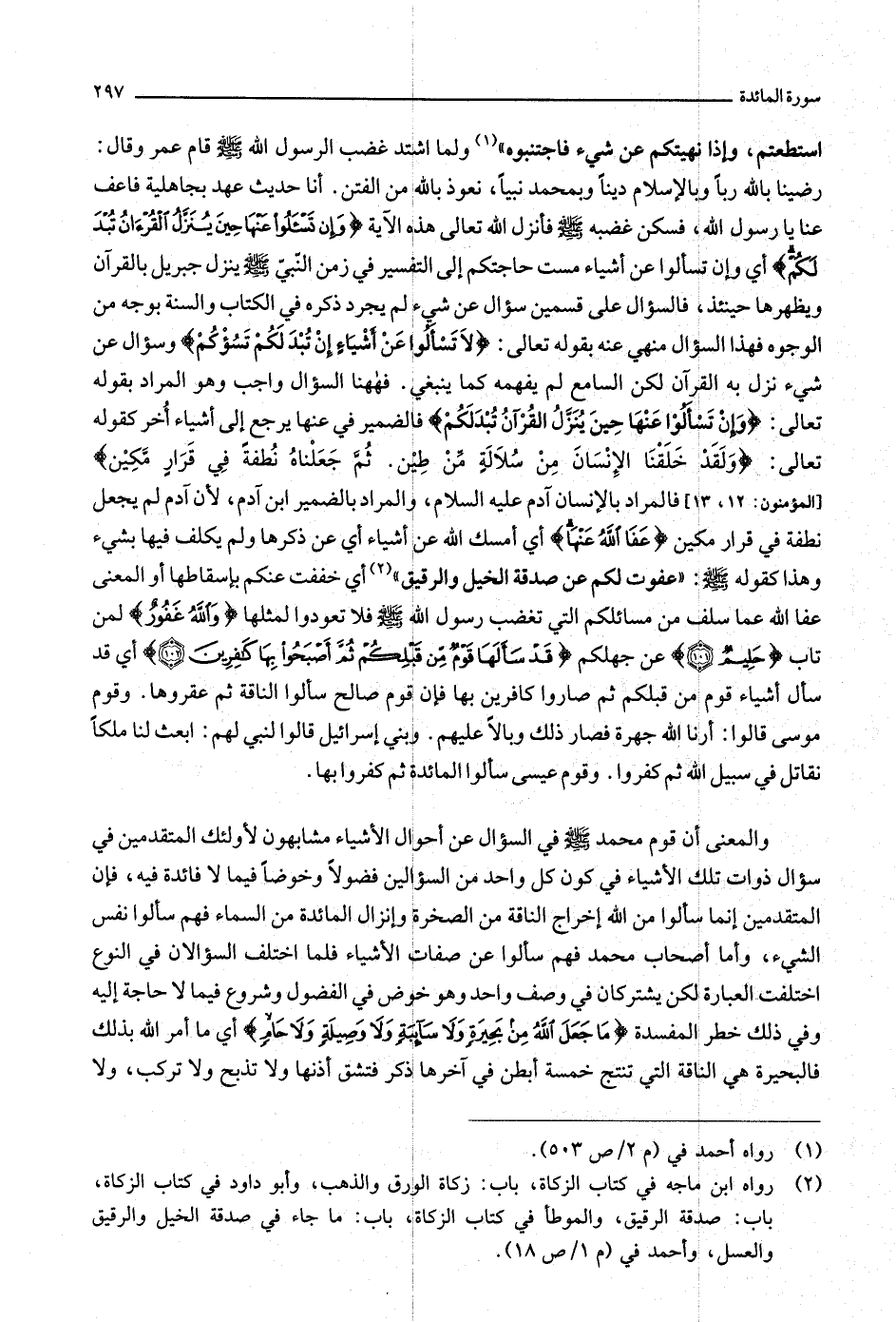 وَإِنْ تَسْئَلُوا عَنْها حِينَ يُنَزَّلُ الْقُرْآنُ تُبْدَ لَكُمْ أي وإن تسألوا عن أشياء مست حاجتكم إلى التفسير في زمن النّبيّ صلّى الله عليه وسلّم ينزل جبريل بالقرآن ويظهرها حينئذ، فالسؤال عن قسمين سؤال عن شيء لم يجرد ذكره في الكتاب والسنة بوجه من الوجوه فهذا السؤال منهي عنه بقوله تعالى: لا تَسْئَلُوا عَنْ أَشْياءَ إِنْ تُبْدَ لَكُمْ تَسُؤْكُمْ وسؤال عن شيء نزل به القرآن لكن السامع لم يفهمه كما ينبغي. فههنا السؤال واجب وهو المراد بقوله تعالى: وَإِنْ تَسْئَلُوا عَنْها حِينَ يُنَزَّلُ الْقُرْآنُ تُبْدَ لَكُمْ فالضمير في عنها يرجع إلى أشياء أخر كقوله تعالى: وَلَقَدْ خَلَقْنَا الْإِنْسانَ مِنْ سُلالَةٍ مِنْ طِينٍ. ثُمَّ جَعَلْناهُ نُطْفَةً فِي قَرارٍ مَكِينٍ [المؤمنون: 12، 13] فالمراد بالإنسان آدم عليه السلام، والمراد بالضمير ابن آدم، لأن آدم لم يجعل نطفة في قرار مكين عَفَا اللَّهُ عَنْها أي أمسك الله عن أشياء أي عن ذكرها ولم يكلف فيها بشيء وهذا