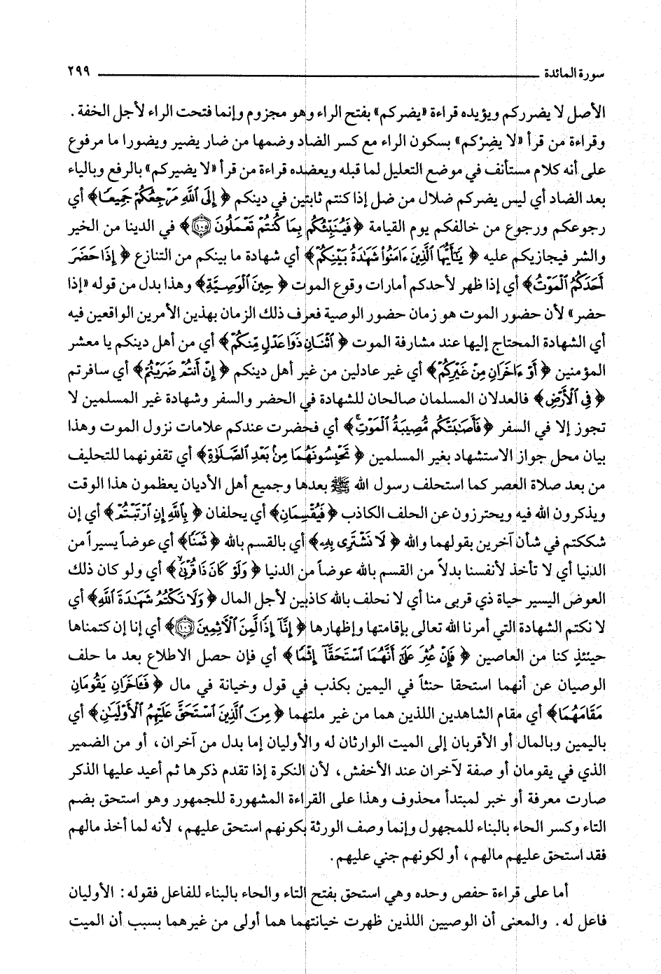 وقراءة من قرأ «لا يضركم» بسكون الراء مع كسر الضاد وضمها من ضار يضير ويضورا ما مرفوع على أنه كلام مستأنف في موضع التعليل لما قبله ويعضده قراءة من قرأ «لا يضيركم» بالرفع وبالياء بعد الضاد أي ليس يضركم ضلال من ضل إذا كنتم ثابتين في دينكم إِلَى اللَّهِ مَرْجِعُكُمْ جَمِيعاً أي رجوعكم ورجوع من خالفكم يوم القيامة فَيُنَبِّئُكُمْ بِما كُنْتُمْ تَعْمَلُونَ (105) في الدنيا من الخير والشر فيجازيكم عليه يا أَيُّهَا الَّذِينَ آمَنُوا شَهادَةُ بَيْنِكُمْ أي شهادة ما بينكم من التنازع إِذا حَضَرَ أَحَدَكُمُ الْمَوْتُ أي إذا ظهر لأحدكم أمارات وقوع الموت حِينَ الْوَصِيَّةِ وهذا بدل من قوله «إذا حضر» لأن حضور الموت هو زمان حضور الوصية فعرف ذلك الزمان بهذين الأمرين الواقعين فيه أي الشهادة المحتاج إليها عند مشارفة الموت اثْنانِ ذَوا عَدْلٍ مِنْكُمْ أي من أهل دينكم يا معشر المؤمنين أَوْ آخَرانِ مِنْ غَيْرِكُمْ أي غير عادلين من غير أهل دينكم إِنْ أَنْتُمْ ضَرَبْتُمْ أي سافرتم فِي الْأَرْضِ فالعدلان المسلمان صالحان للشهادة في الحضر والسفر وشهادة غير المسلمين لا تجوز إلا في السفر فَأَصابَتْكُمْ مُصِيبَةُ الْمَوْتِ أي فحضرت عندكم علامات نزول الموت وهذا بيان محل جواز الاستشهاد بغير المسلمين تَحْبِسُونَهُما مِنْ بَعْدِ الصَّلاةِ أي تقفونهما للتحليف من بعد صلاة العصر كما استحلف رسول الله صلّى الله عليه وسلّم بعدها وجميع أهل الأديان يعظمون هذا الوقت ويذكرون الله فيه ويحترزون عن الحلف الكاذب فَيُقْسِمانِ أي يحلفان بِاللَّهِ إِنِ ارْتَبْتُمْ أي إن شككتم في شأن آخرين بقولهما والله لا نَشْتَرِي بِهِ أي بالقسم بالله ثَمَناً أي عوضا يسيرا من الدنيا أي لا تأخذ لأنفسنا بدلا من القسم بالله عوضا من الدنيا وَلَوْ كانَ ذا قُرْبى أي ولو كان ذلك العوض اليسير حياة ذي قربى منا أي لا نحلف بالله كاذبين لأجل المال وَلا نَكْتُمُ شَهادَةَ اللَّهِ أي لا نكتم الشهادة التي أمرنا الله تعالى بإقامتها وإظهارها إِنَّا إِذاً لَمِنَ الْآثِمِينَ (106) أي إنا إن كتمناها حينئذ كنا من العاصين فَإِنْ عُثِرَ عَلى أَنَّهُمَا اسْتَحَقَّا إِثْماً أي فإن حصل الاطلاع بعد ما حلف الوصيان عن أنهما استحقا حنثا في اليمين بكذب في قول وخيانة في مال فَآخَرانِ يَقُومانِ مَقامَهُما أي مقام الشاهدين اللذين هما من غير ملتهما مِنَ الَّذِينَ اسْتَحَقَّ عَلَيْهِمُ الْأَوْلَيانِ أي باليمين وبالمال أو الأقربان إلى الميت الوارثان له والأوليان إما بدل من آخران، أو من الضمير الذي في يقومان أو صفة لآخران عند الأخفش، لأن النكرة إذا تقدم ذكرها ثم أعيد عليها الذكر صارت معرفة أو خبر لمبتدأ محذوف وهذا على القراءة المشهورة للجمهور وهو استحق بضم التاء وكسر الحاء بالبناء للمجهول وإنما وصف الورثة بكونهم استحق عليهم، لأنه لما أخذ مالهم فقد استحق عليهم مالهم، أو لكونهم جني عليهم.
