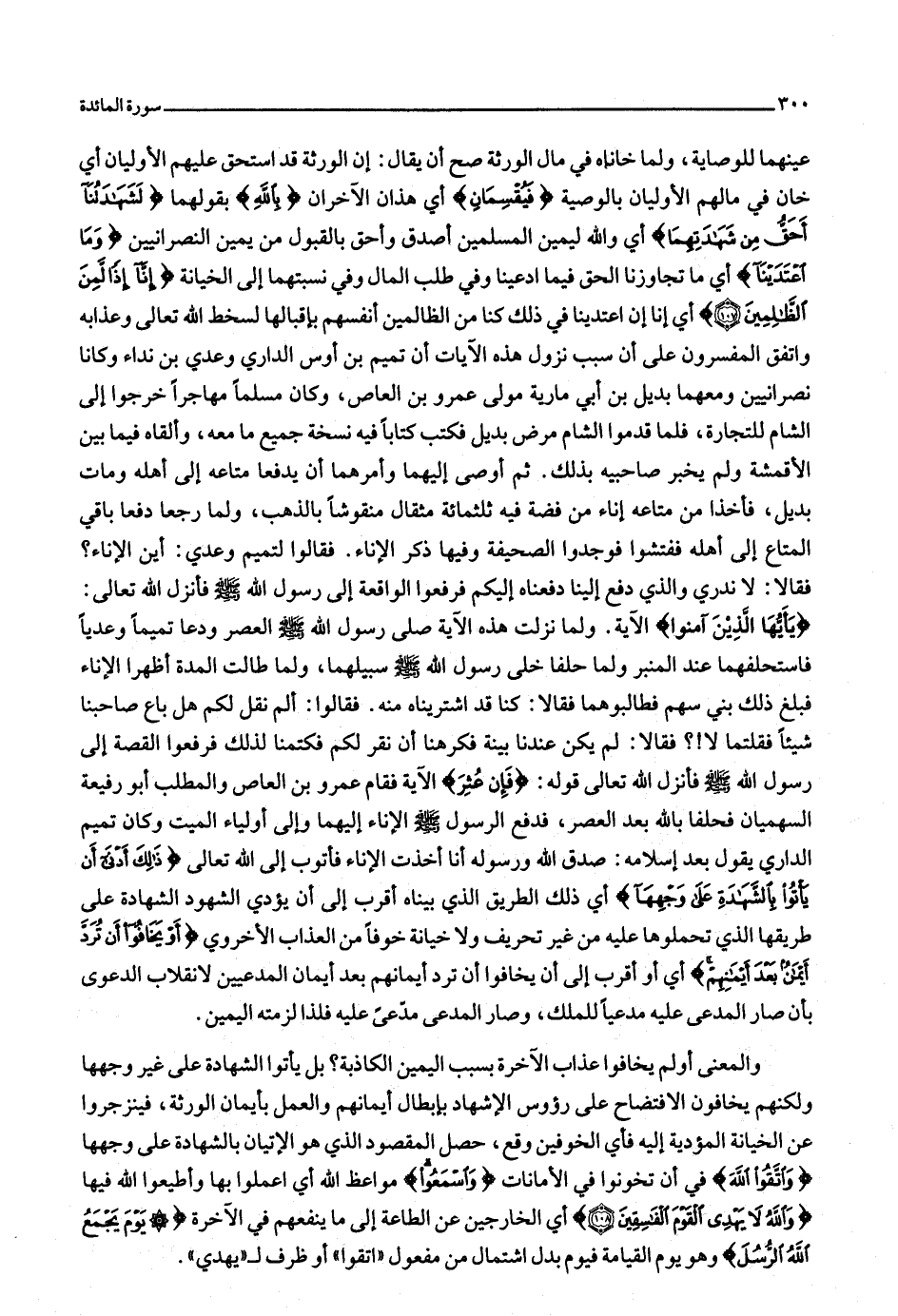 يا أَيُّهَا الَّذِينَ آمَنُوا الآية. ولما نزلت هذه الآية صلّى رسول الله صلّى الله عليه وسلّم العصر ودعا تميما وعديا فاستحلفهما عند المنبر ولما حلفا خلى رسول الله صلّى الله عليه وسلّم سبيلهما، ولما طالت المدة أظهرا الإناء فبلغ ذلك بني سهم فطالبوهما فقالا: كنا قد اشتريناه منه. فقالوا: ألم نقل لكم هل باع صاحبنا شيئا فقلتما لا!؟ فقالا: لم يكن عندنا بينة فكرهنا أن نقر لكم فكتمنا لذلك فرفعوا القصة إلى رسول الله صلّى الله عليه وسلّم فأنزل الله تعالى قوله: فَإِنْ عُثِرَ الآية فقام عمرو بن العاص والمطلب أبو رفيعة السهميان فحلفا بالله بعد العصر، فدفع الرسول صلّى الله عليه وسلّم الإناء إليهما وإلى أولياء الميت وكان تميم الداري يقول بعد إسلامه: صدق الله ورسوله أنا أخذت الإناء فأتوب إلى الله تعالى ذلِكَ أَدْنى أَنْ يَأْتُوا بِالشَّهادَةِ عَلى وَجْهِها أي ذلك الطريق الذي بيناه أقرب إلى أن يؤدي الشهود الشهادة على طريقها الذي تحملوها عليه من غير تحريف ولا خيانة خوفا من العذاب الأخروي أَوْ يَخافُوا أَنْ تُرَدَّ أَيْمانٌ بَعْدَ أَيْمانِهِمْ أي أو أقرب إلى أن يخافوا أن ترد أيمانهم بعد أيمان المدعيين لانقلاب الدعوى بأن صار المدعى عليه مدعيا للملك، وصار المدعى مدّعى عليه فلذا لزمته اليمين.
