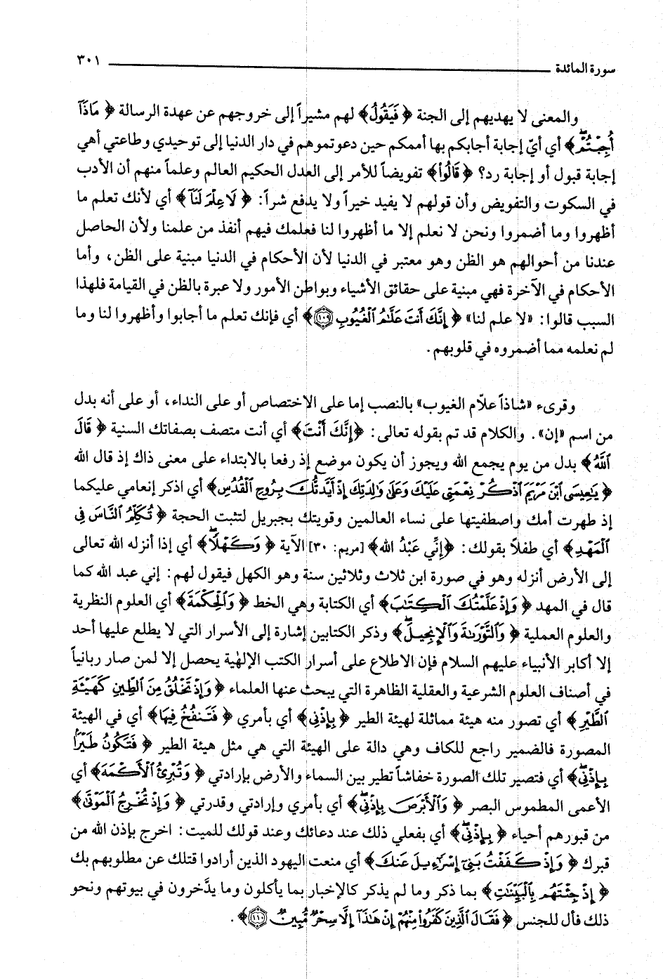 وقرئ «شاذا علّام الغيوب» بالنصب إما على الاختصاص أو على النداء، أو على أنه بدل من اسم «إن» . والكلام قد تم بقوله تعالى: إِنَّكَ أَنْتَ أي أنت متصف بصفاتك السنية قالَ اللَّهُ بدل من يوم يجمع الله ويجوز أن يكون موضع إذ رفعا بالابتداء على معنى ذاك إذ قال الله يا عِيسَى ابْنَ مَرْيَمَ اذْكُرْ نِعْمَتِي عَلَيْكَ وَعَلى والِدَتِكَ إِذْ أَيَّدْتُكَ بِرُوحِ الْقُدُسِ أي اذكر إنعامي عليكما إذ طهرت أمك واصطفيتها على نساء العالمين وقويتك بجبريل لتثبت الحجة تُكَلِّمُ النَّاسَ فِي الْمَهْدِ أي طفلا بقولك: إِنِّي عَبْدُ اللَّهِ [مريم: 30] الآية وَكَهْلًا أي إذا أنزله الله تعالى إلى الأرض أنزله وهو في صورة ابن ثلاث وثلاثين سنة وهو الكهل فيقول لهم: إني عبد الله كما قال في المهد وَإِذْ عَلَّمْتُكَ الْكِتابَ أي الكتابة وهي الخط وَالْحِكْمَةَ أي العلوم النظرية والعلوم العملية وَالتَّوْراةَ وَالْإِنْجِيلَ وذكر الكتابين إشارة إلى الأسرار التي لا يطلع عليها أحد إلا أكابر الأنبياء عليهم السلام فإن الاطلاع على أسرار الكتب الإلهية يحصل إلا لمن صار ربانيا في أصناف العلوم الشرعية والعقلية الظاهرة التي يبحث عنها العلماء وَإِذْ تَخْلُقُ مِنَ الطِّينِ كَهَيْئَةِ الطَّيْرِ أي تصور منه هيئة مماثلة لهيئة الطير بِإِذْنِي أي بأمري فَتَنْفُخُ فِيها أي في الهيئة المصورة فالضمير راجع للكاف وهي دالة على الهيئة التي هي مثل هيئة الطير فَتَكُونُ طَيْراً بِإِذْنِي أي فتصير تلك الصورة خفاشا تطير بين السماء والأرض بإرادتي وَتُبْرِئُ الْأَكْمَهَ أي الأعمى المطموس البصر وَالْأَبْرَصَ بِإِذْنِي أي بأمري وإرادتي وقدرتي وَإِذْ تُخْرِجُ الْمَوْتى من قبورهم أحياء بِإِذْنِي أي بفعلي ذلك عند دعائك وعند قولك للميت: اخرج بإذن الله من قبرك وَإِذْ كَفَفْتُ بَنِي إِسْرائِيلَ عَنْكَ أي منعت اليهود الذين أرادوا قتلك عن مطلوبهم بك إِذْ جِئْتَهُمْ بِالْبَيِّناتِ بما ذكر وما لم يذكر كالإخبار بما يأكلون وما يدّخرون في بيوتهم ونحو ذلك فأل للجنس فَقالَ الَّذِينَ كَفَرُوا مِنْهُمْ إِنْ هذا إِلَّا سِحْرٌ مُبِينٌ (110) .