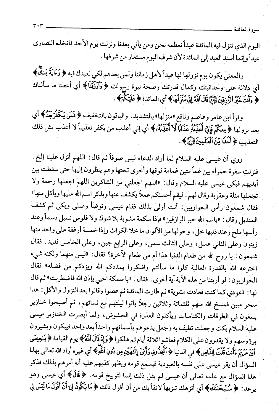 فنزلت سفرة حمراء بين غما متين غمامة فوقها وأخرى تحتها وهم ينظرون إليها حتى سقطت بين أيديهم فبكى عيسى عليه السلام وقال: «اللهم اجعلني من الشاكرين اللهم اجعلها رحمة ولا تجعلها مثلة وعقوبة وقال لهم: ليقم أحسنكم عملا يكشف عنها ويذكر اسم الله عليها ويأكل منها» فقال شمعون رأس الحواريين: أنت أولى بذلك فقام عيسى وتوضأ وصلى وبكى ثم كشف المنديل وقال: «باسم الله خير الرازقين» فإذا سمك ة مشوية بلا شوك ولا فلوس تسيل دسما وعند رأسها ملح وعند ذنبها خل، وحولها من الألوان ما خلا الكراث وإذا خمسة أرغفة على واحد منها زيتون وعلى الثاني عسل، وعلى الثالث سمن، وعلى الرابع جبن، وعلى الخامس قديد. فقال شمعون: يا روح الله من طعام الدنيا هذا أم من طعام الآخرة؟ فقال: «ليس منهما ولكنه شيء اخترعه الله بالقدرة العالية كلوا ما سألتم واشكروا يمددكم الله ويزدكم من فضله» فقال الحواريون: لو أريتنا من هذه الآية آية أخرى. فقال: «يا سمكة احيي بإذن الله فاضطربت» ثم قال لها: «عودي كما كنت فعادت مشوية» ثم طارت المائدة ثم عصوا وقالوا بعد النزول والأكل: هذا سحر مبين فمسخ الله منهم ثلاثمائة وثلاثين رجلا باتوا ليلتهم مع نسائهم، ثم أصبحوا خنازير يسعون في الطرقات والكناسات ويأكلون العذرة في الحشوش، ولما أبصرت الخنازير عيسى عليه السلام بكت وجعلت تطيف به وجعل يدعوهم بأسمائهم واحدا بعد واحد فيبكون ويشيرون برءوسهم ولا يقدرون على الكلام فعاشوا ثلاثة أيام ثم هلكوا وَإِذْ قالَ اللَّهُ يوم القيامة يا عِيسَى ابْنَ مَرْيَمَ أَأَنْتَ قُلْتَ لِلنَّاسِ في الدنيا اتَّخِذُونِي وَأُمِّي إِلهَيْنِ مِنْ دُونِ اللَّهِ أي غيره أراد الله تعالى بهذا السؤال أن يقر عيسى على نفسه بالعبودية فيسمع قومه ويظهر كذبهم عليه أنه أمرهم بذلك فذكر هذا السؤال مع علمه تعالى أن عيسى لم يقل ذلك إنما لتوبيخ قومه. قالَ أي عيسى وهو يرعد: سُبْحانَكَ أي أنزهك تنزيها لائقا بك من أن أقول ذلك ما يَكُونُ لِي أَنْ أَقُولَ ما لَيْسَ لِي