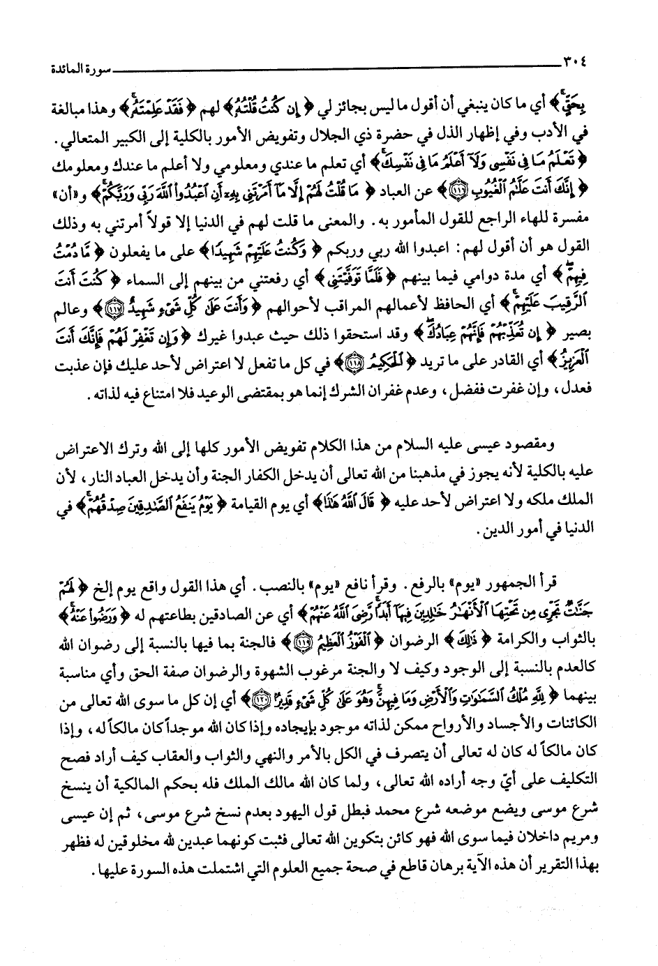 تَعْلَمُ ما فِي نَفْسِي وَلا أَعْلَمُ ما فِي نَفْسِكَ أي تعلم ما عندي ومعلومي ولا أعلم ما عندك ومعلومك إِنَّكَ أَنْتَ عَلَّامُ الْغُيُوبِ (116) عن العباد ما قُلْتُ لَهُمْ إِلَّا ما أَمَرْتَنِي بِهِ أَنِ اعْبُدُوا اللَّهَ رَبِّي وَرَبَّكُمْ و «أن» مفسرة للهاء الراجع للقول المأمور به. والمعنى ما قلت لهم في الدنيا إلا قولا أمرتني به وذلك القول هو أن أقول لهم: اعبدوا الله ربي وربكم وَكُنْتُ عَلَيْهِمْ شَهِيداً على ما يفعلون ما دُمْتُ فِيهِمْ أي مدة دوامي فيما بينهم فَلَمَّا تَوَفَّيْتَنِي أي رفعتني من بينهم إلى السماء كُنْتَ أَنْتَ الرَّقِيبَ عَلَيْهِمْ أي الحافظ لأعمالهم المراقب لأحوالهم وَأَنْتَ عَلى كُلِّ شَيْءٍ شَهِيدٌ (117) وعالم بصير إِنْ تُعَذِّبْهُمْ فَإِنَّهُمْ عِبادُكَ وقد استحقوا ذلك حيث عبدوا غيرك وَإِنْ تَغْفِرْ لَهُمْ فَإِنَّكَ أَنْتَ الْعَزِيزُ أي القادر على ما تريد الْحَكِيمُ (118) في كل ما تفعل لا اعتراض لأحد عليك فإن عذبت فعدل، وإن غفرت ففضل، وعدم غفران الشرك إنما هو بمقتضى الوعيد فلا امتناع فيه لذاته.