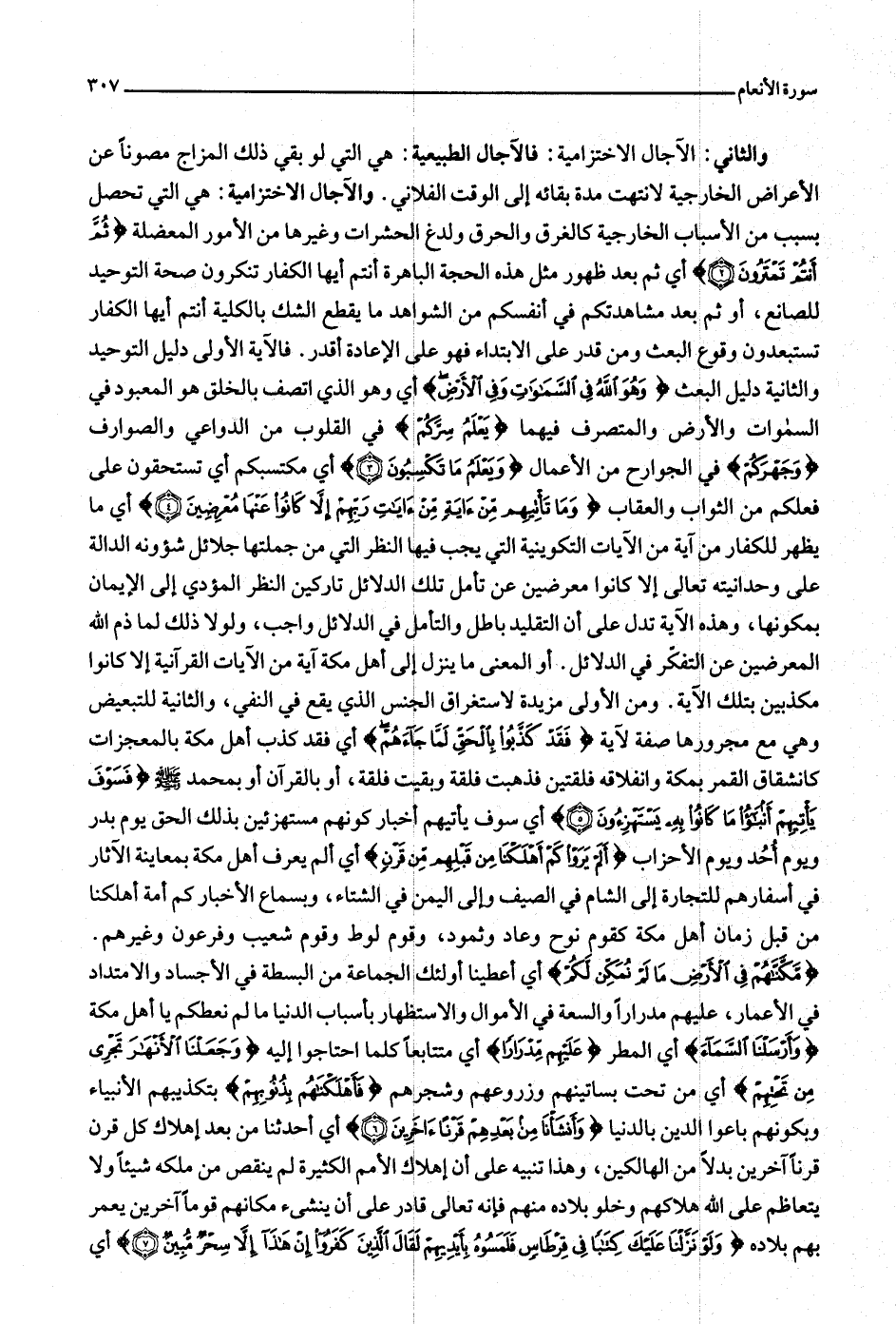 والثاني: الآجال الاختزامية: فالآجال الطبيعية: هي التي لو بقي ذلك المزاج مصونا عن الأعراض الخارجية لانتهت مدة بقائه إلى الوقت الفلاني. والآجال الاختزامية: هي التي تحصل بسبب من الأسباب الخارجية كالغرق والحرق ولدغ الحشرات وغيرها من الأمور المعضلة ثُمَّ أَنْتُمْ تَمْتَرُونَ (2) أي ثم بعد ظهور مثل هذه الحجة الباهرة أنتم أيها الكفار تنكرون صحة التوحيد للصانع، أو ثم بعد مشاهدتكم في أنفسكم من الشواهد ما يقطع الشك بالكلية أنتم أيها الكفار تستبعدون وقوع البعث ومن قدر على الابتداء فهو على الإعادة أقدر. فالآية الأولى دليل التوحيد والثانية دليل البعث وَهُوَ اللَّهُ فِي السَّماواتِ وَفِي الْأَرْضِ أي وهو الذي اتصف بالخلق هو المعبود في السموات والأرض والمتصرف فيهما يَعْلَمُ سِرَّكُمْ في القلوب من الدواعي والصوارف وَجَهْرَكُمْ في الجوارح من الأعمال وَيَعْلَمُ ما تَكْسِبُونَ (3) أي مكتسبكم أي تستحقون على فعلكم من الثواب والعقاب وَما تَأْتِيهِمْ مِنْ آيَةٍ مِنْ آياتِ رَبِّهِمْ إِلَّا كانُوا عَنْها مُعْرِضِينَ (4) أي ما يظهر للكفار من آية من الآيات التكوينية التي يجب فيها النظر التي من جملتها جلائل شؤونه الدالة على وحدانيته تعالى إلا كانوا معرضين عن تأمل تلك الدلائل تاركين النظر المؤدي إلى الإيمان بمكونها، وهذه الآية تدل على أن التقليد باطل والتأمل في الدلائل واجب، ولولا ذلك لما ذم الله المعرضين عن التفكّر في الدلائل. أو المعنى ما ينزل إلى أهل مكة آية من الآيات القرآنية إلا كانوا مكذبين بتلك الآية. ومن الأولى مزيدة لاستغراق الجنس الذي يقع في النفي، والثانية للتبعيض وهي مع مجرورها صفة لآية فَقَدْ كَذَّبُوا بِالْحَقِّ لَمَّا جاءَهُمْ أي فقد كذب أهل مكة بالمعجزات كانشقاق القمر بمكة وانفلاقه فلقتين فذهبت فلقة وبقيت فلقة، أو بالقرآن أو بمحمد صلّى الله عليه وسلّم فَسَوْفَ يَأْتِيهِمْ أَنْباءُ ما كانُوا بِهِ يَسْتَهْزِؤُنَ (5) أي سوف يأتيهم أخبار كونهم مستهزئين بذلك الحق يوم بدر ويوم أحد ويوم الأحزاب أَلَمْ يَرَوْا كَمْ أَهْلَكْنا مِنْ قَبْلِهِمْ مِنْ قَرْنٍ أي ألم يعرف أهل مكة بمعاينة الآثار في أسفارهم للتجارة إلى الشام في الصيف وإلى اليمن في الشتاء، وبسماع الأخباركم أمة أهلكنا من قبل زمان أهل مكة كقوم نوح وعاد وثمود، وقوم لوط وقوم شعيب وفرعون وغيرهم.