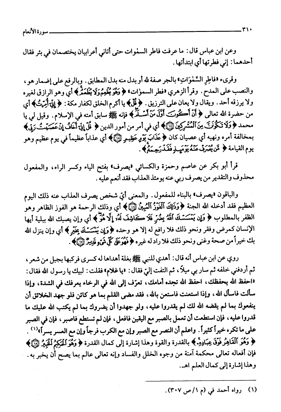 «احفظ الله يحفظك، احفظ الله تجده أمامك، تعرّف إلى الله في الرخاء يعرفك في الشدة، وإذا سألت فاسأل الله، وإذا استعنت فاستعن بالله، فقد مضى القلم بما هو كائن فلو جهد الخلائق أن ينفعوك بما لم يقضه الله لك لم يقدروا عليه، ولو جهدوا أن يضروك بما لم يكتب الله عليك ما قدروا عليه، فإن استطعت أن تعمل بالصبر مع اليقين فافعل، فإن لم تستطع فاصبر، فإن في الصبر على ما تكره خيرا كثيرا. واعلم أن النصر مع الصبر وإن مع الكرب فرجا وإن مع العسر يسرا»