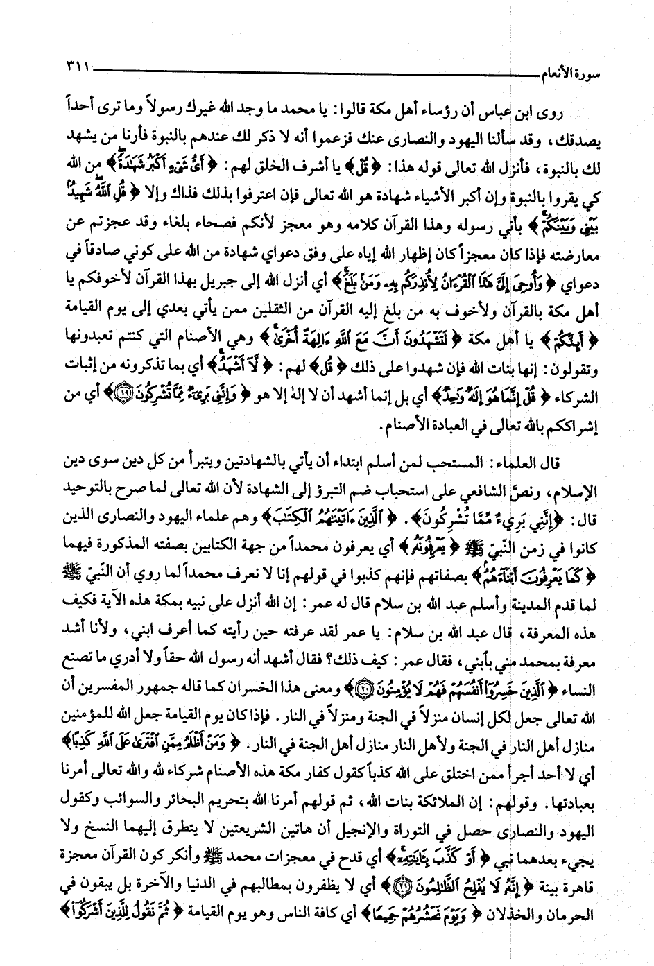قال العلماء: المستحب لمن أسلم ابتداء أن يأتي بالشهادتين ويتبرأ من كل دين سوى دين الإسلام، ونصّ الشافعي على استحباب ضم التبرؤ إلى الشهادة لأن الله تعالى لما صرح بالتوحيد قال: إِنَّنِي بَرِيءٌ مِمَّا تُشْرِكُونَ. الَّذِينَ آتَيْناهُمُ الْكِتابَ وهم علماء اليهود والنصارى الذين كانوا في زمن النّبيّ صلّى الله عليه وسلّم يَعْرِفُونَهُ أي يعرفون محمدا من جهة الكتابين بصفته المذكورة فيهما كَما يَعْرِفُونَ أَبْناءَهُمُ بصفاتهم فإنهم كذبوا في قولهم إنا لا نعرف محمدا لما روي أن النّبيّ صلّى الله عليه وسلّم لما قدم المدينة وأسلم عبد الله بن سلام قال له عمر: إن الله أنزل على نبيه بمكة هذه الآية فكيف هذه المعرفة، قال عبد الله بن سلام: يا عمر لقد عرفته حين رأيته كما أعرف ابني، ولأنا أشد معرفة بمحمد مني بابني، فقال عمر: كيف ذلك؟ فقال أشهد أنه رسول الله حقا ولا أدري ما تصنع النساء الَّذِينَ خَسِرُوا أَنْفُسَهُمْ فَهُمْ لا يُؤْمِنُونَ (20) ومعنى هذا الخسران كما قاله جمهور المفسرين أن الله تعالى جعل لكل إنسان منزلا في الجنة ومنزلا في النار. فإذا كان يوم القيامة جعل الله للمؤمنين منازل أهل النار في الجنة ولأهل النار منازل أهل الجنة في النار.