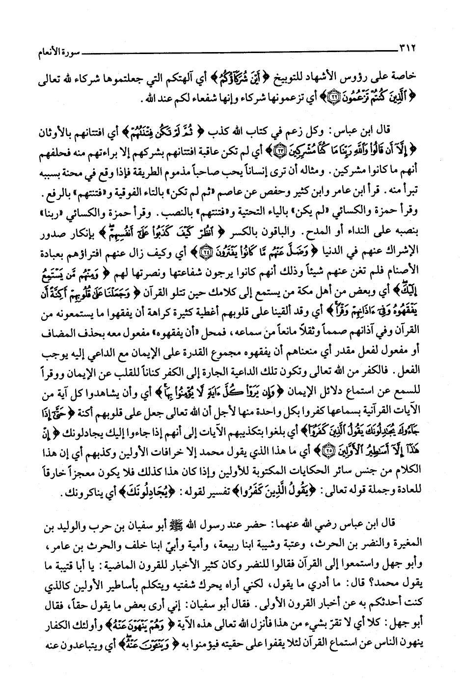 وقرأ حمزة والكسائي «لم يكن» بالياء التحتية و «فتنتهم» بالنصب. وقرأ حمزة والكسائي «ربنا» بنصبه على النداء أو المدح. والباقون بالكسر انْظُرْ كَيْفَ كَذَبُوا عَلى أَنْفُسِهِمْ بإنكار صدور الإشراك عنهم في الدنيا وَضَلَّ عَنْهُمْ ما كانُوا يَفْتَرُونَ (24) أي وكيف زال عنهم افتراؤهم بعبادة الأصنام فلم تغن عنهم شيئا وذلك أنهم كانوا يرجون شفاعتها ونصرتها لهم وَمِنْهُمْ مَنْ يَسْتَمِعُ إِلَيْكَ أي وبعض من أهل مكة من يستمع إلى كلامك حين تتلو القرآن وَجَعَلْنا عَلى قُلُوبِهِمْ أَكِنَّةً أَنْ يَفْقَهُوهُ وَفِي آذانِهِمْ وَقْراً أي وقد ألقينا على قلوبهم أغطية كثيرة كراهة أن يفقهوا ما يستمعونه من القرآن وفي آذانهم صمما وثقلا مانعا من سماعه، فمحل «أن يفقهوه» مفعول معه بحذف المضاف أو مفعول لفعل مقدر أي منعناهم أن يفقهوه مجموع القدرة على الإيمان مع الداعي إليه يوجب الفعل. فالكفر من الله تعالى وتكون تلك الداعية الجارة إلى الكفر كنانا للقلب عن الإيمان ووقرا للسمع عن استماع دلائل الإيمان وَإِنْ يَرَوْا كُلَّ آيَةٍ لا يُؤْمِنُوا بِها أي وأن يشاهدوا كل آية من الآيات القرآنية بسماعها كفروا بكل واحدة منها لأجل أن الله تعالى جعل على قلوبهم أكنة حَتَّى إِذا جاؤُكَ يُجادِلُونَكَ يَقُولُ الَّذِينَ كَفَرُوا أي بلغوا بتكذيبهم الآيات إلى أنهم إذا جاءوا إليك يجادلونك إِنْ هذا إِلَّا أَساطِيرُ الْأَوَّلِينَ (25) أي ما هذا الذي يقول محمد إلا خرافات الأولين وكذبهم أي إن هذا الكلام من جنس سائر الحكايات المكتوبة للأولين وإذا كان هذا كذلك فلا يكون معجزا خارقا للعادة وجملة قوله تعالى: يَقُولُ الَّذِينَ كَفَرُوا تفسير لقوله: يُجادِلُونَكَ أي يناكرونك.
