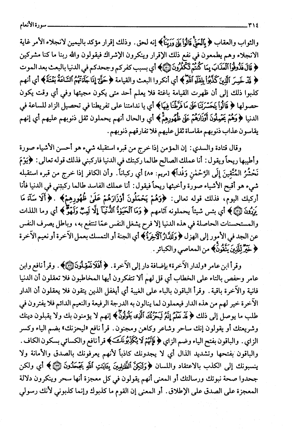 وقرأ ابن عامر «ولدار الآخرة» بإضافة دار إلى الآخرة. أَفَلا تَعْقِلُونَ (32) . وقرأ نافع وابن عامر وحفص بالتاء على الخطاب أي قل لهم ألا تتفكرون أيها المخاطبون فلا تعقلون أن الدنيا فانية والآخرة باقية. وقرأ الباقون بالباء على الغيبة أي أيغفل الذين يتقون فلا يعقلون أن الدار الآخرة خير لهم من هذه الدار فيعملون لما ينالون به الدرجة الرفيعة والنعيم الدائم فلا يفترون في طلب ما يوصل إلى ذلك قَدْ نَعْلَمُ إِنَّهُ لَيَحْزُنُكَ الَّذِي يَقُولُونَ إنهم لا يؤمنون بك ولا يقبلون دينك وشريعتك أو يقولون إنك ساحر وشاعر وكاهن ومجنون. قرأ نافع «ليحزنك» بضم الياء وكسر الزاي. والباقون بفتح الياء وضم الزاي فَإِنَّهُمْ لا يُكَذِّبُونَكَ قرأ نافع والكسائي بسكون الكاف.