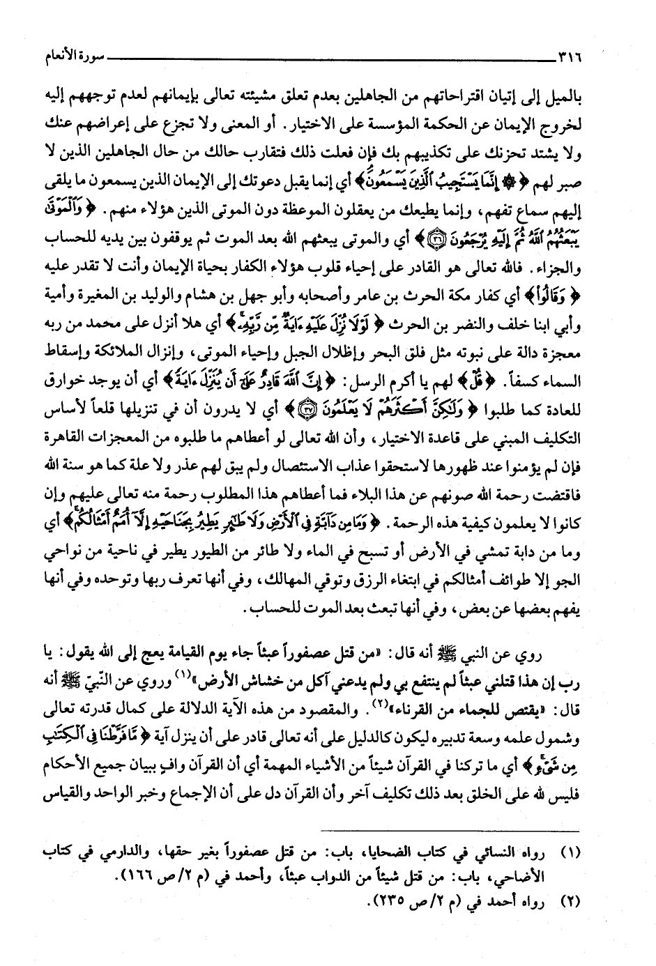 (1) رواه النسائي في كتاب الضحايا، باب: من قتل عصفورا بغير حقها، والدارمي في كتاب الأضاحي، باب: من قتل شيئا من الدواب عبثا، وأحمد في (م 2/ ص 166) .