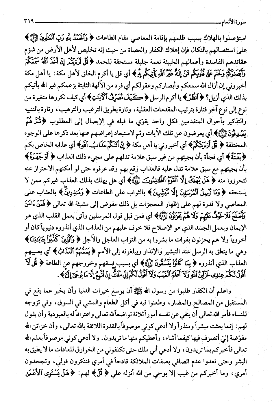استؤصلوا بالهلاك بسبب ظلمهم بإقامة المعاصي مقام الطاعات وَالْحَمْدُ لِلَّهِ رَبِّ الْعالَمِينَ (45) على استئصالهم بالنكال فإن إهلاك الكفار والعصاة من حيث إنه تخليص لأهل الأرض من شؤم عقائدهم الفاسدة وأعمالهم الخبيثة نعمة جليلة مستحقة للحمد قُلْ أَرَأَيْتُمْ إِنْ أَخَذَ اللَّهُ سَمْعَكُمْ وَأَبْصارَكُمْ وَخَتَمَ عَلى قُلُوبِكُمْ مَنْ إِلهٌ غَيْرُ اللَّهِ يَأْتِيكُمْ بِهِ أي قل يا أكرم الخلق لأهل مكة: يا أهل مكة أخبروني إن أزال الله سمعكم وأبصاركم وعقولكم أي فرد من الآلهة الثابتة بزعمكم غير الله يأتيكم بذلك الذي أزيل؟ انْظُرْ يا أكرم الرسل كَيْفَ نُصَرِّفُ الْآياتِ أي كيف نكررها متغيرة من نوع إلى نوع آخر فتارة بترتيب المقدمات العقلية، وتارة بطريق الترغيب والترهيب، وتارة بالتنبيه والتذكير بأحوال المتقدمين فكل واحد يقوّي ما قبله في الإيصال إلى المطلوب ثُمَّ هُمْ يَصْدِفُونَ (46) أي يعرضون عن تلك الآيات وثم لاستبعاد إعراضهم عنها بعد ذكرها على الوجوه المختلفة قُلْ أَرَأَيْتَكُمْ أي أخبروني يا أهل مكة إِنْ أَتاكُمْ عَذابُ اللَّهِ أي عذابه الخاص بكم بَغْتَةً أي فجأة بأن يجيئهم من غير سبق علامة تدلهم على مجيء ذلك العذاب أَوْ جَهْرَةً بأن يجيئهم مع سبق علامة تدل عليه فالعذاب وقع بهم وقد عرفوه حتى لو أمكنهم الاحتراز عنه لتحرزوا منه هَلْ يُهْلَكُ إِلَّا الْقَوْمُ الظَّالِمُونَ (47) أي هل يهلك بذلك العذاب غيركم ممن لا يستحقه وَما نُرْسِلُ الْمُرْسَلِينَ إِلَّا مُبَشِّرِينَ بالثواب على الطاعات وَمُنْذِرِينَ بالعقاب على المعاصي ولا قدرة لهم على إظهار المعجزات بل ذلك مفوض إلى مشيئة الله تعالى فَمَنْ آمَنَ وَأَصْلَحَ فَلا خَوْفٌ عَلَيْهِمْ وَلا هُمْ يَحْزَنُونَ (48) أي فمن قبل قول المرسلين وأتى بعمل القلب الذي هو الإيمان وبعمل الجسد الذي هو الإصلاح فلا خوف عليهم من العذاب الذي أنذروه دنيويا كان أو أخرويا ولا هم يحزنون بفوات ما بشروا به من الثواب العاجل والآجل وَالَّذِينَ كَذَّبُوا بِآياتِنا وهي ما ينطق به الرسل عند التبشير والإنذار ويبلغونه إلى الأمم يَمَسُّهُمُ الْعَذابُ أي يصيبهم العذاب الذي أنذروه بِما كانُوا يَفْسُقُونَ (49) أي بسبب فسقهم وخروجهم عن الطاعة قُلْ لا أَقُولُ لَكُمْ عِنْدِي خَزائِنُ اللَّهِ وَلا أَعْلَمُ الْغَيْبَ وَلا أَقُولُ لَكُمْ إِنِّي مَلَكٌ إِنْ أَتَّبِعُ إِلَّا ما يُوحى إِلَيَّ.