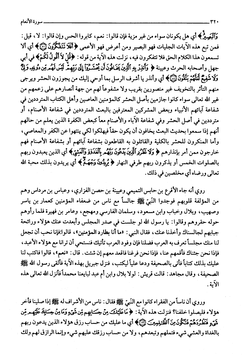 وروي أن ناسا من الفقراء كانوا مع النّبيّ صلّى الله عليه وسلّم فقال: ناس من الأشراف له صلّى الله عليه وسلّم إذا صلينا فأخر هؤلاء فليصلوا خلفنا؟ فنزلت هذه الآية: ما عَلَيْكَ مِنْ حِسابِهِمْ مِنْ شَيْءٍ وَما مِنْ حِسابِكَ عَلَيْهِمْ مِنْ شَيْءٍ فَتَطْرُدَهُمْ فَتَكُونَ مِنَ الظَّالِمِينَ (52) أي ما عليك من حساب رزق هؤلاء الذين يدعون ربهم بالغداة والعشي شيء فتملهم وتبعدهم، ولا من حساب رزقك عليهم شيء وإنما الرازق لهم ولك