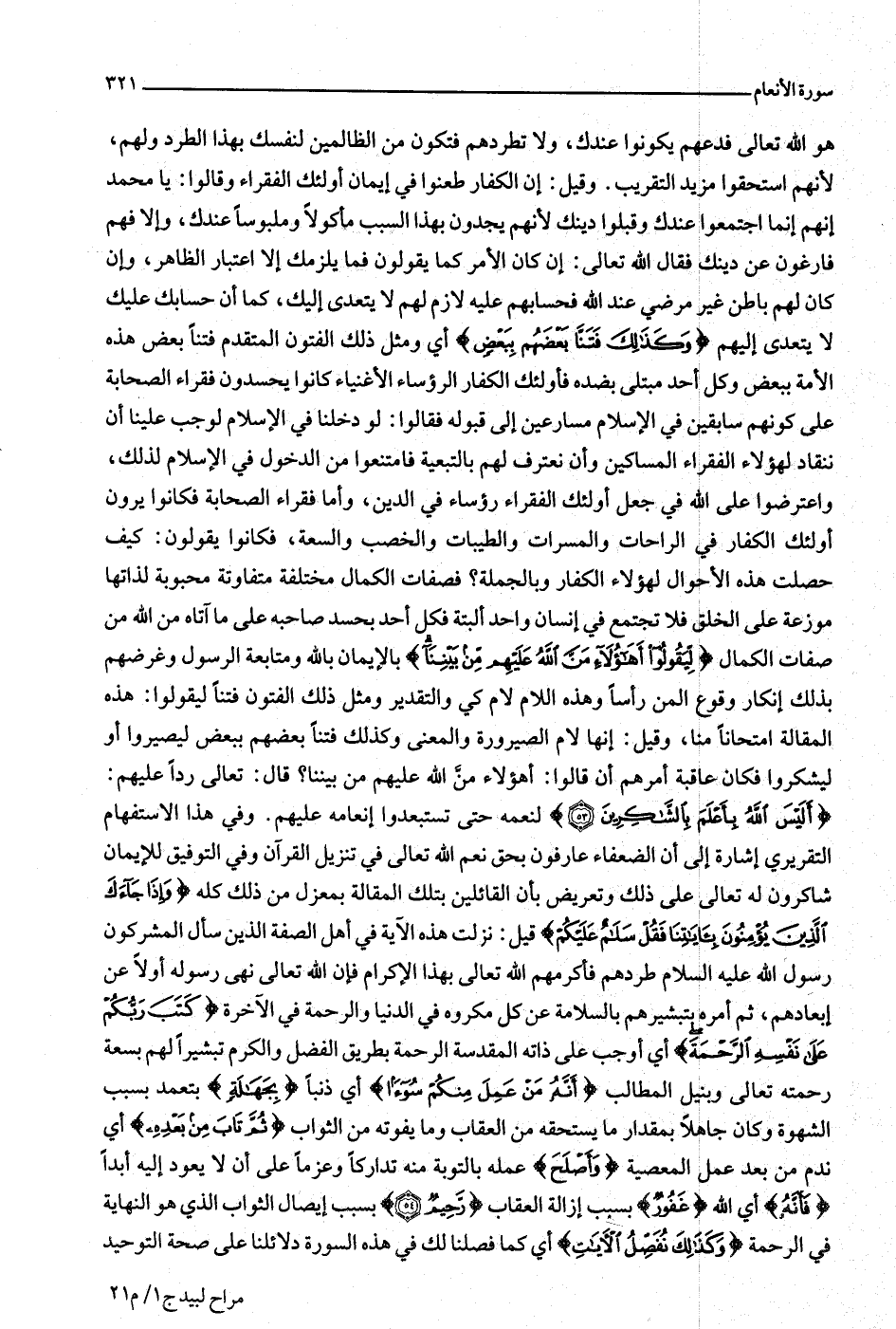 هو الله تعالى فدعهم يكونوا عندك، ولا تطردهم فتكون من الظالمين لنفسك بهذا الطرد ولهم، لأنهم استحقوا مزيد التقريب. وقيل: إن الكفار طعنوا في إيمان أولئك الفقراء وقالوا: يا محمد إنهم إنما اجتمعوا عندك وقبلوا دينك لأنهم يجدون بهذا السبب مأكولا وملبوسا عندك، وإلا فهم فارغون عن دينك فقال الله تعالى: إن كان الأمر كما يقولون فما يلزمك إلا اعتبار الظاهر، وإن كان لهم باطن غير مرضي عند الله فحسابهم عليه لازم لهم لا يتعدى إليك، كما أن حسابك عليك لا يتعدى إليهم وَكَذلِكَ فَتَنَّا بَعْضَهُمْ بِبَعْضٍ أي ومثل ذلك الفتون المتقدم فتنا بعض هذه الأمة ببعض وكل أحد مبتلى بضده فأولئك الكفار الرؤساء الأغنياء كانوا يحسدون فقراء الصحابة على كونهم سابقين في الإسلام مسارعين إلى قبوله فقالوا: لو دخلنا في الإسلام لوجب علينا أن ننقاد لهؤلاء الفقراء المساكين وأن نعترف لهم بالتبعية فامتنعوا من الدخول في الإسلام لذلك، واعترضوا على الله في جعل أولئك الفقراء رؤساء في الدين، وأما فقراء الصحابة فكانوا يرون أولئك الكفار في الراحات والمسرات والطيبات والخصب والسعة، فكانوا يقولون: كيف حصلت هذه الأحوال لهؤلاء الكفار وبالجملة؟ فصفات الكمال مختلفة متفاوتة محبوبة لذاتها موزعة على الخلق فلا تجتمع في إنسان واحد ألبتة فكل أحد بحسد صاحبه على ما آتاه من الله من صفات الكمال لِيَقُولُوا أَهؤُلاءِ مَنَّ اللَّهُ عَلَيْهِمْ مِنْ بَيْنِنا بالإيمان بالله ومتابعة الرسول وغرضهم بذلك إنكار وقوع المن رأسا وهذه اللام لام كي والتقدير ومثل ذلك الفتون فتنا ليقولوا: هذه المقالة امتحانا منا، وقيل: إنها لام الصيرورة والمعنى وكذلك فتنا بعضهم ببعض ليصيروا أو ليشكروا فكان عاقبة أمرهم أن قالوا: أهؤلاء منّ الله عليهم من بيننا؟ قال: تعالى ردا عليهم: