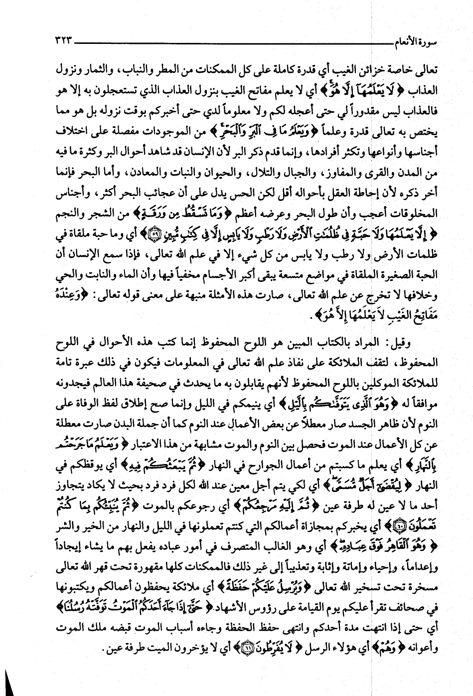 وقيل: المراد بالكتاب المبين هو اللوح المحفوظ إنما كتب هذه الأحوال في اللوح المحفوظ، لتقف الملائكة على نفاذ علم الله تعالى في المعلومات فيكون في ذلك عبرة تامة للملائكة الموكلين باللوح المحفوظ لأنهم يقابلون به ما يحدث في صحيفة هذا العالم فيجدونه موافقا له وَهُوَ الَّذِي يَتَوَفَّاكُمْ بِاللَّيْلِ أي ينيمكم في الليل وإنما صح إطلاق لفظ الوفاة على النوم لأن ظاهر الجسد صار معطلا عن بعض الأعمال عند النوم كما أن جملة البدن صارت معطلة عن كل الأعمال عند الموت فحصل بين النوم والموت مشابهة من هذا الاعتبار وَيَعْلَمُ ما جَرَحْتُمْ بِالنَّهارِ أي يعلم ما كسبتم من أعمال الجوارح في النهار ثُمَّ يَبْعَثُكُمْ فِيهِ أي يوقظكم في النهار لِيُقْضى أَجَلٌ مُسَمًّى أي لكي يتم أجل معين عند الله لكل فرد فرد بحيث لا يكاد يتجاوز أحد ما لا عين له طرفة عين ثُمَّ إِلَيْهِ مَرْجِعُكُمْ أي رجوعكم بالموت ثُمَّ يُنَبِّئُكُمْ بِما كُنْتُمْ تَعْمَلُونَ (60) أي يخبركم بمجازاة أعمالكم التي كنتم تعملونها في الليل والنهار من الخير والشر