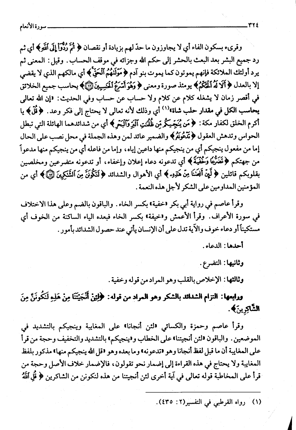وقرأ عاصم وحمزة والكسائي «لئن أنجانا» على المغايبة وينجيكم بالتشديد في الموضعين. والباقون «لئن أنجيتنا» على الخطاب و «ينجيكم» بالتشديد والتخفيف وحجة من قرأ على المغايبة أن ما قبل لفظ أنجانا وهو «تدعونه» وما بعده وهو «قل الله ينجيكم منها» مذكور بلفظ المغايبة ولا يحتاج في هذه القراءة إلى إضمار نحو تقولون، فالإضمار خلاف الأصل وحجة من قرأ على المخاطبة قوله تعالى في آية أخرى لئن أنجيتنا من هذه لنكونن من الشاكرين قُلِ اللَّهُ يُنَجِّيكُمْ مِنْها