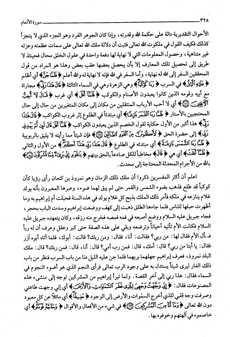 الأحوال التقديرية دالة على حكمة الله وقدرته، وإذا كان الجوهر الفرد وهو الجزء الذي لا يتجزأ كذلك فكيف القول في ملكوت الله تعالى فثبت أن دلالة ملك الله تعالى على سمات عظمته وعزته غير متناهية، وحصول المعلومات التي لا نهاية لها دفعة واحدة في عقول الخلق محال فحينئذ لا طريق إلى تحصيل تلك المعارف إلا بأن يحصل بعضها عقب بعض وهذا هو المراد من قول المحققين السفر إلى الله له نهاية، وأما السفر في الله فإنه لا نهاية له والله أعلم فَلَمَّا جَنَّ أي أظلم عَلَيْهِ اللَّيْلُ في السرب رَأى كَوْكَباً وهي الزهرة وهي في السماء الثالثة قالَ هذا رَبِّي مجاراة مع أبيه وقومه الذين كانوا يعبدون الأصنام والكوكب فَلَمَّا أَفَلَ أي غرب قالَ لا أُحِبُّ الْآفِلِينَ (76) أي لا أحب الأرباب المنتقلين من مكان إلى مكان المتغيرين من حال إلى حال المحتجبين بالأستار فَلَمَّا رَأَى الْقَمَرَ بازِغاً أي مبتدئا في الطلوع إثر غروب الكواكب قالَ هذا رَبِّي هذا أكبر من الأول حكاية لقول الخصم الذين يعبدون الكواكب فَلَمَّا أَفَلَ قالَ لَئِنْ لَمْ يَهْدِنِي رَبِّي إلى حضرة الحق لَأَكُونَنَّ مِنَ الْقَوْمِ الضَّالِّينَ (77) فإن شيئا مما رأيته لا يليق بالربوبية فَلَمَّا رَأَى الشَّمْسَ بازِغَةً أي مبتدئه في الطلوع قالَ هذا رَبِّي هذا أَكْبَرُ من الأول والثاني فَلَمَّا أَفَلَتْ أي هي قالَ مخاطبا للكل صادعا بالحق بينهم يا قَوْمِ إِنِّي بَرِيءٌ مِمَّا تُشْرِكُونَ (78) بالله من الأجرام المحدثة المحتاجة إلى محدث.