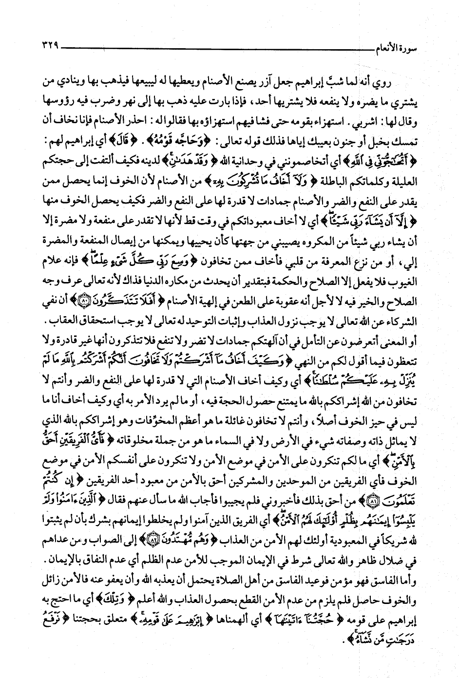 وَكَيْفَ أَخافُ ما أَشْرَكْتُمْ وَلا تَخافُونَ أَنَّكُمْ أَشْرَكْتُمْ بِاللَّهِ ما لَمْ يُنَزِّلْ بِهِ عَلَيْكُمْ سُلْطاناً أي وكيف أخاف الأصنام التي لا قدرة لها على النفع والضر وأنتم لا تخافون من الله إشراككم بالله ما يمتنع حصول الحجة فيه، أو ما لم يرد الأمر به أي وكيف أخاف أنا ما ليس في حيز الخوف أصلا، وأنتم لا تخافون غائلة ما هو أعظم المخوّفات وهو إشراككم بالله الذي لا يماثل ذاته وصفاته شيء في الأرض ولا في السماء ما هو من جملة مخلوقاته فَأَيُّ الْفَرِيقَيْنِ أَحَقُّ بِالْأَمْنِ أي ما لكم تنكرون على الأمن في موضع الأمن ولا تنكرون على أنفسكم الأمن في موضع الخوف فأي الفريقين من الموحدين والمشركين أحق بالأمن من معبود أحد الفريقين إِنْ كُنْتُمْ تَعْلَمُونَ (81) من أحق بذلك فأخبروني فلم يجيبوا فأجاب الله ما سأل عنهم فقال الَّذِينَ آمَنُوا وَلَمْ يَلْبِسُوا إِيمانَهُمْ بِظُلْمٍ أُولئِكَ لَهُمُ الْأَمْنُ أي الفريق الذين آمنوا ولم يخلطوا إيمانهم بشرك بأن لم يثبتوا لله شريكا في المعبودية أولئك لهم الأمن من العذاب وَهُمْ مُهْتَدُونَ (82) إلى الصواب ومن عداهم في ضلال ظاهر والله تعالى شرط في الإيمان الموجب للأمن عدم الظلم أي عدم النفاق بالإيمان.