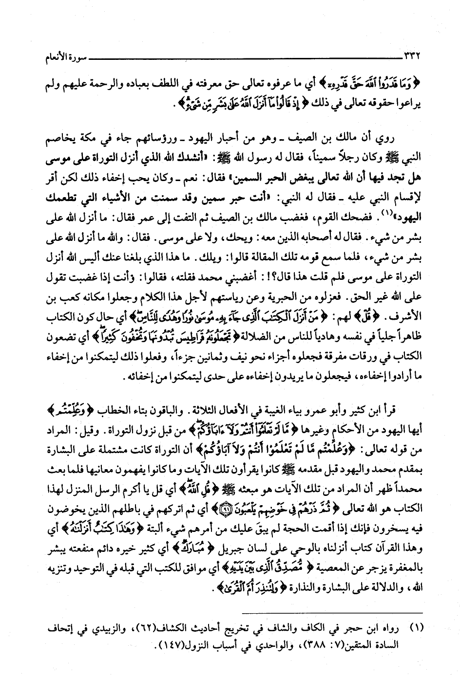 قُلْ لهم: مَنْ أَنْزَلَ الْكِتابَ الَّذِي جاءَ بِهِ مُوسى نُوراً وَهُدىً لِلنَّاسِ أي حال كون الكتاب ظاهرا جليا في نفسه وهاديا للناس من الضلالة تَجْعَلُونَهُ قَراطِيسَ تُبْدُونَها وَتُخْفُونَ كَثِيراً أي تضعون الكتاب في ورقات مفرقة فجعلوه أجزاء نحو نيف وثمانين جزءا، وفعلوا ذلك ليتمكنوا من إخفاء ما أرادوا إخفاءه، فيجعلون ما يريدون إخفاءه على حدى ليتمكنوا من إخفائه.