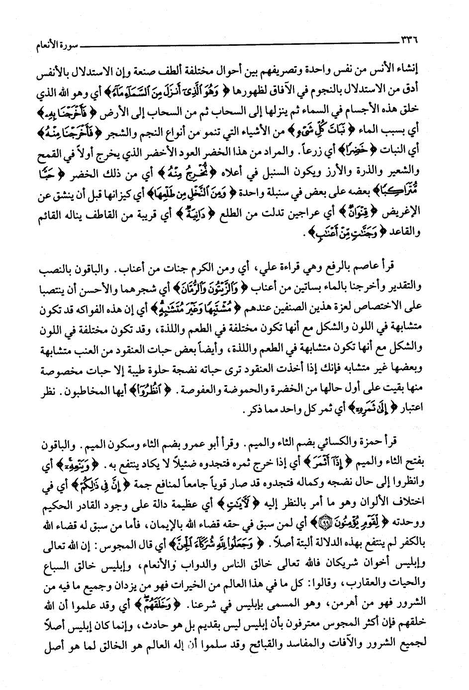 قرأ عاصم بالرفع وهي قراءة علي، أي ومن الكرم جنات من أعناب. والباقون بالنصب والتقدير وأخرجنا بالماء بساتين من أعناب وَالزَّيْتُونَ وَالرُّمَّانَ أي شجرهما والأحسن أن ينتصبا على الاختصاص لعزة هذين الصنفين عندهم مُشْتَبِهاً وَغَيْرَ مُتَشابِهٍ أي إن هذه الفواكه قد تكون متشابهة في اللون والشكل مع أنها تكون مختلفة في الطعم واللذة، وقد تكون مختلفة في اللون والشكل مع أنها تكون متشابهة في الطعم واللذة، وأيضا بعض حبات العنقود من العنب متشابهة وبعضها غير متشابه فإنك إذا أخذت العنقود ترى حباته نضجة حلوة طيبة إلا حبات مخصوصة منها بقيت على أول حالها من الخضرة والحموضة والعفوصة. انْظُرُوا أيها المخاطبون. نظر اعتبار إِلى ثَمَرِهِ أي ثمر كل واحد مما ذكر.