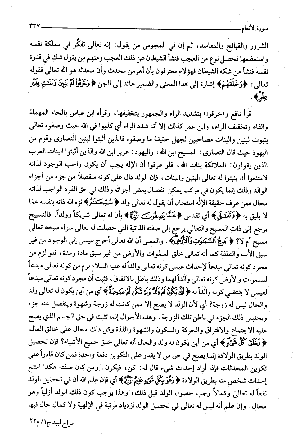 قرأ نافع و «خرقوا» بتشديد الراء والجمهور بتخفيفها، وقرأه ابن عباس بالحاء المهملة والفاء وتخفيف الراء، وابن عمر كذلك إلا أنه شدد الراء أي كذبوا في الله حيث وصفوه تعالى بثبوت البنين والبنات مصاحبين لجهل حقيقة ما وصفوه فالذين أثبتوا لبنين النصارى وقوم من اليهود حيث قال النصارى: المسيح ابن الله، واليهود: عزير ابن الله والذين أثبتوا البنات العرب الذين يقولون: الملائكة بنات الله، فلو عرفوا أن الإله يجب أن يكون واجب الوجود لذاته لامتنعوا أن يثبتوا له تعالى البنين والبنات، فإن الولد دال على كونه منفصلا من جزء من أجزاء الوالد وذلك إنما يكون في مركب يمكن انفصال بعض أجزائه وذلك في حق الفرد الواجب لذاته محال فمن عرف حقيقة الإله استحال أن يقول له تعالى ولد سُبْحانَهُ نزه الله ذاته بنفسه عمّا لا يليق به وَتَعالى أي تقدس عَمَّا يَصِفُونَ (100) بأن له تعالى شريكا وولدا. فالتسبيح يرجع إلى ذات المسبح والتعالي يرجع إلى صفته الذاتية التي حصلت له تعالى سواء سبحه تعالى مسبح أم لا؟