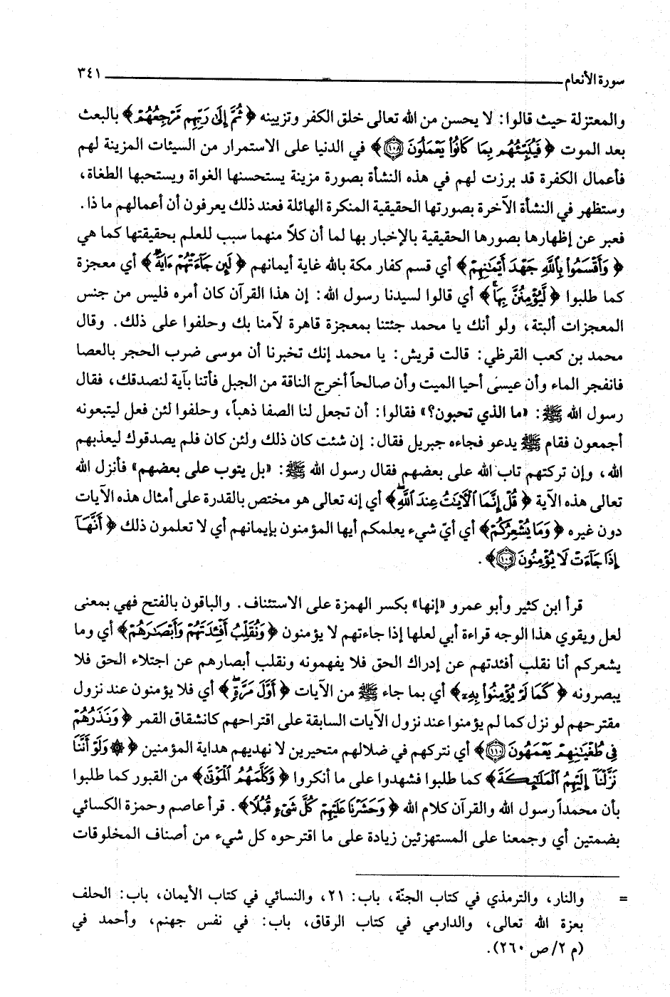قرأ ابن كثير وأبو عمرو «إنها» بكسر الهمزة على الاستئناف. والباقون بالفتح فهي بمعنى لعل ويقوي هذا الوجه قراءة أبي لعلها إذا جاءتهم لا يؤمنون وَنُقَلِّبُ أَفْئِدَتَهُمْ وَأَبْصارَهُمْ أي وما يشعركم أنا نقلب أفئدتهم عن إدراك الحق فلا يفهمونه ونقلب أبصارهم عن اجتلاء الحق فلا يبصرونه كَما لَمْ يُؤْمِنُوا بِهِ أي بما جاء صلّى الله عليه وسلّم من الآيات أَوَّلَ مَرَّةٍ أي فلا يؤمنون عند نزول مقترحهم لو نزل كما لم يؤمنوا عند نزول الآيات السابقة على اقتراحهم كانشقاق القمر وَنَذَرُهُمْ فِي طُغْيانِهِمْ يَعْمَهُونَ (110) أي نتركهم في ضلالهم متحيرين لا نهديهم هداية المؤمنين