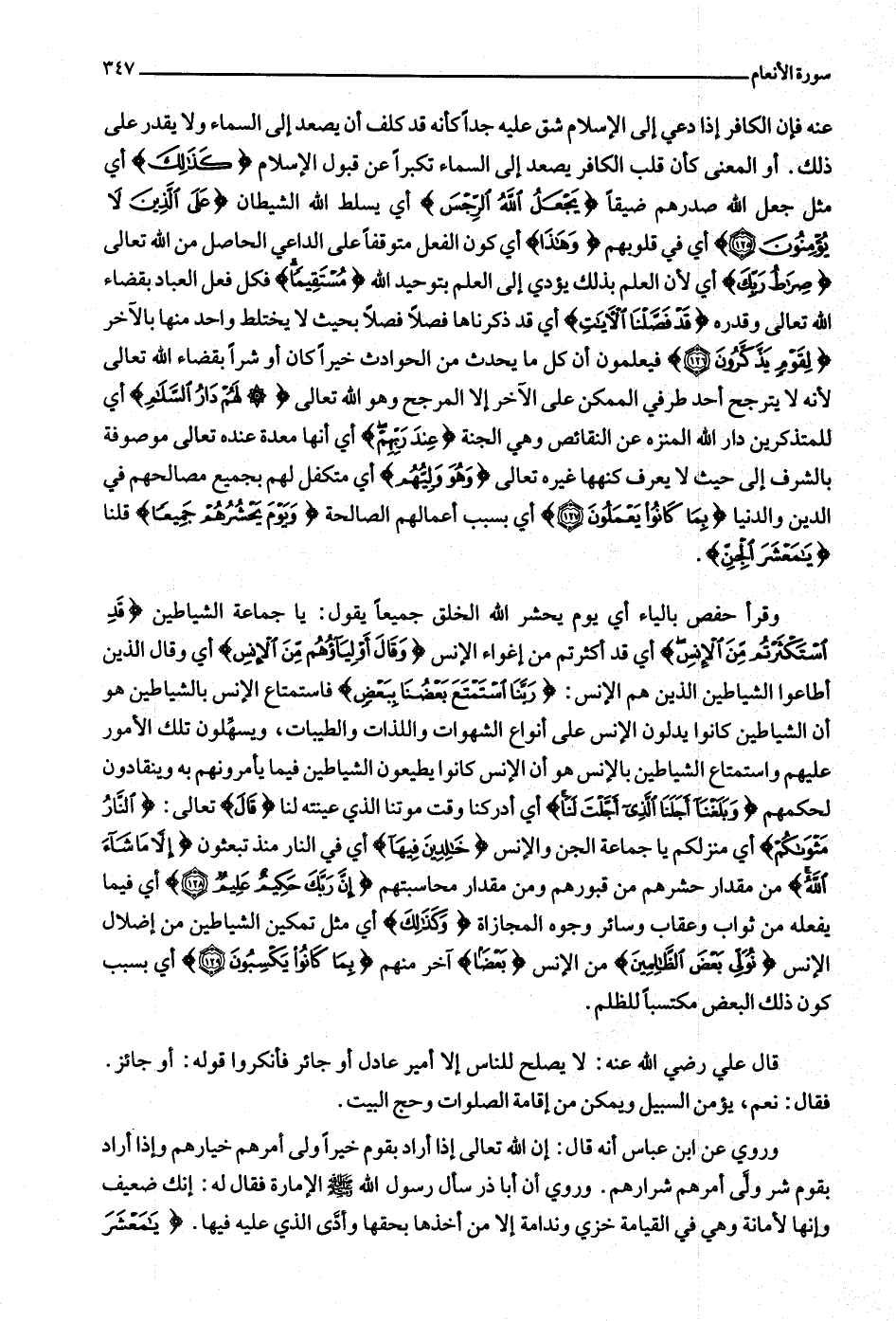عنه فإن الكافر إذا دعي إلى الإسلام شق عليه جدا كأنه قد كلف أن يصعد إلى السماء ولا يقدر على ذلك. أو المعنى كأن قلب الكافر يصعد إلى السماء تكبرا عن قبول الإسلام كَذلِكَ أي مثل جعل الله صدرهم ضيقا يَجْعَلُ اللَّهُ الرِّجْسَ أي يسلط الله الشيطان عَلَى الَّذِينَ لا يُؤْمِنُونَ (125) أي في قلوبهم وَهذا أي كون الفعل متوقفا على الداعي الحاصل من الله تعالى صِراطُ رَبِّكَ أي لأن العلم بذلك يؤدي إلى العلم بتوحيد الله مُسْتَقِيماً فكل فعل العباد بقضاء الله تعالى وقدره قَدْ فَصَّلْنَا الْآياتِ أي قد ذكرناها فصلا فصلا بحيث لا يختلط واحد منها بالآخر لِقَوْمٍ يَذَّكَّرُونَ (126) فيعلمون أن كل ما يحدث من الحوادث خيرا كان أو شرا بقضاء الله تعالى لأنه لا يترجح أحد طرفي الممكن على الآخر إلا المرجح وهو الله تعالى لَهُمْ دارُ السَّلامِ أي للمتذكرين دار الله المنزه عن النقائص وهي الجنة عِنْدَ رَبِّهِمْ أي أنها معدة عنده تعالى موصوفة بالشرف إلى حيث لا يعرف كنهها غيره تعالى وَهُوَ وَلِيُّهُمْ أي متكفل لهم بجميع مصالحهم في الدين والدنيا بِما كانُوا يَعْمَلُونَ (127) أي بسبب أعمالهم الصالحة وَيَوْمَ يَحْشُرُهُمْ جَمِيعاً قلنا يا مَعْشَرَ الْجِنِّ.