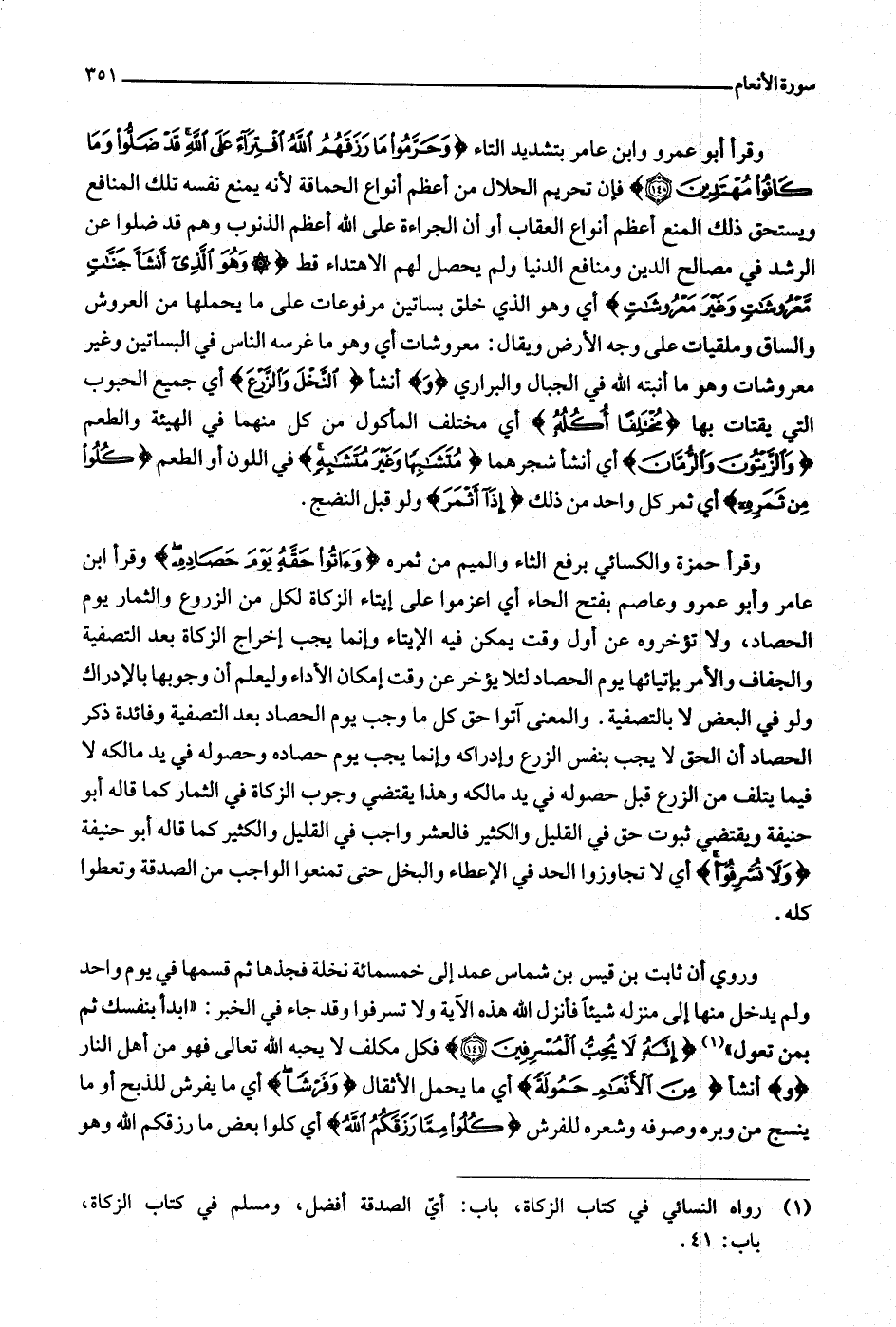 وقرأ حمزة والكسائي برفع الثاء والميم من ثمره وَآتُوا حَقَّهُ يَوْمَ حَصادِهِ وقرأ ابن عامر وأبو عمرو وعاصم بفتح الحاء أي اعزموا على إيتاء الزكاة لكل من الزروع والثمار يوم الحصاد، ولا تؤخروه عن أول وقت يمكن فيه الإيتاء وإنما يجب إخراج الزكاة بعد التصفية والجفاف والأمر بإيتائها يوم الحصاد لئلا يؤخر عن وقت إمكان الأداء وليعلم أن وجوبها بالإدراك ولو في البعض لا بالتصفية. والمعنى آتوا حق كل ما وجب يوم الحصاد بعد التصفية وفائدة ذكر الحصاد أن الحق لا يجب بنفس الزرع وإدراكه وإنما يجب يوم حصاده وحصوله في يد مالكه لا فيما يتلف من الزرع قبل حصوله في يد مالكه وهذا يقتضي وجوب الزكاة في الثمار كما قاله أبو حنيفة ويقتضي ثبوت حق في القليل والكثير فالعشر واجب في القليل والكثير كما قاله أبو حنيفة وَلا تُسْرِفُوا أي لا تجاوزوا الحد في الإعطاء والبخل حتى تمنعوا الواجب من الصدقة وتعطوا كله.