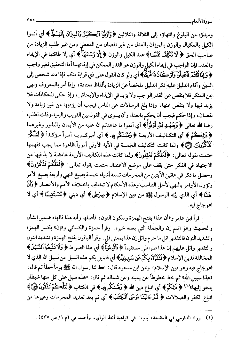 «1» ذلِكُمْ أي اتباع دين الله وَصَّاكُمْ بِهِ في الكتاب لَعَلَّكُمْ تَتَّقُونَ (153) اتباع الكفر والضلالات ثُمَّ آتَيْنا مُوسَى الْكِتابَ أي ثم بعد تعديد المحرمات وغيرها من