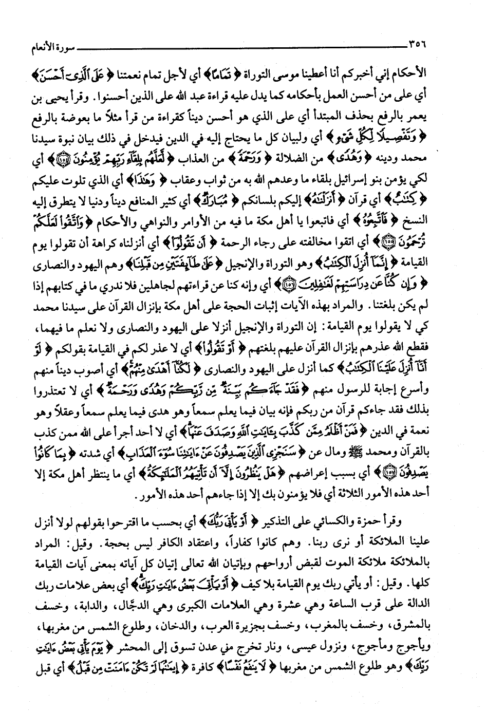 الأحكام إني أخبركم أنا أعطينا موسى التوراة تَماماً أي لأجل تمام نعمتنا عَلَى الَّذِي أَحْسَنَ أي على من أحسن العمل بأحكامه كما يدل عليه قراءة عبد الله على الذين أحسنوا. وقرأ يحيى بن يعمر بالرفع بحذف المبتدأ أي على الذي هو أحسن دينا كقراءة من قرأ مثلا ما بعوضة بالرفع وَتَفْصِيلًا لِكُلِّ شَيْءٍ أي ولبيان كل ما يحتاج إليه في الدين فيدخل في ذلك بيان نبوة سيدنا محمد ودينه وَهُدىً من الضلالة وَرَحْمَةً من العذاب لَعَلَّهُمْ بِلِقاءِ رَبِّهِمْ يُؤْمِنُونَ (154) أي لكي يؤمن بنو إسرائيل بلقاء ما وعدهم الله به من ثواب وعقاب وَهذا أي الذي تلوت عليكم كِتابٌ أي قرآن أَنْزَلْناهُ إليكم بلسانكم مُبارَكٌ أي كثير المنافع دينا ودنيا لا يتطرق إليه النسخ فَاتَّبِعُوهُ أي فاتبعوا يا أهل مكة ما فيه من الأوامر والنواهي والأحكام وَاتَّقُوا لَعَلَّكُمْ تُرْحَمُونَ (155) أي اتقوا مخالفته على رجاء الرحمة أَنْ تَقُولُوا أي أنزلناه كراهة أن تقولوا يوم القيامة إِنَّما أُنْزِلَ الْكِتابُ وهو التوراة والإنجيل عَلى طائِفَتَيْنِ مِنْ قَبْلِنا وهم اليهود والنصارى وَإِنْ كُنَّا عَنْ دِراسَتِهِمْ لَغافِلِينَ (156) أي وإنه كنا عن قراءتهم لجاهلين فلا ندري ما في كتابهم إذا لم يكن بلغتنا. والمراد بهذه الآيات إثبات الحجة على أهل مكة بإنزال القرآن على سيدنا محمد كي لا يقولوا يوم القيامة: إن التوراة والإنجيل أنزلا على اليهود والنصارى ولا نعلم ما فيهما، فقطع الله عذرهم بإنزال القرآن عليهم بلغتهم أَوْ تَقُولُوا أي لا عذر لكم في القيامة بقولكم لَوْ أَنَّا أُنْزِلَ عَلَيْنَا الْكِتابُ كما أنزل على اليهود والنصارى لَكُنَّا أَهْدى مِنْهُمْ أي أصوب دينا منهم وأسرع إجابة للرسول منهم فَقَدْ جاءَكُمْ بَيِّنَةٌ مِنْ رَبِّكُمْ وَهُدىً وَرَحْمَةٌ أي لا تعتذروا بذلك فقد جاءكم قرآن من ربكم فإنه بيان فيما يعلم سمعا وهو هدى فيما يعلم سمعا وعقلا وهو نعمة في الدين فَمَنْ أَظْلَمُ مِمَّنْ كَذَّبَ بِآياتِ اللَّهِ وَصَدَفَ عَنْها أي لا أحد أجرأ على الله ممن كذب بالقرآن ومحمد صلّى الله عليه وسلّم ومال عن سَنَجْزِي الَّذِينَ يَصْدِفُونَ عَنْ آياتِنا سُوءَ الْعَذابِ أي شدته بِما كانُوا يَصْدِفُونَ (157) أي بسبب إعراضهم هَلْ يَنْظُرُونَ إِلَّا أَنْ تَأْتِيَهُمُ الْمَلائِكَةُ أي ما ينتظر أهل مكة إلا أحد هذه الأمور الثلاثة أي فلا يؤمنون بك إلا إذا جاءهم أحد هذه الأمور.