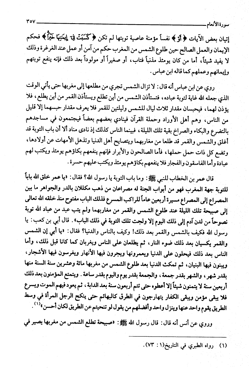 روي عن ابن عباس أنه قال: لا تزال الشمس تجري من مطلعها إلى مغربها حتى يأتي الوقت الذي جعله الله غاية لتوبة عباده، فتستأذن الشمس من أين تطلع ويستأذن القمر من أين يطلع، فلا يؤذن لهما، فيحبسان مقدار ثلاث ليال للشمس وليلتين للقمر فلا يعرف مقدار حبسهما إلا قليل من الناس، وهم أهل الأوراد وحملة القرآن فينادي بعضهم بعضا فيجتمعون في مساجدهم بالتضرع والبكاء والصراخ بقية تلك الليلة، فبينما الناس كذلك إذ نادى مناد ألا أن باب التوبة قد أغلق والشمس والقمر قد طلعا من مغاربهما ويتصايح أهل الدنيا وتذهل الأمهات عن أولادها، وتضع كل ذات حمل حملها، فأما الصالحون والأبرار فإنهم ينفعهم بكاؤهم يومئذ ويكتب لهم عبادة وأما الفاسقون والفجار فلا ينفعهم بكاؤهم يومئذ ويكتب عليهم حسرة.
