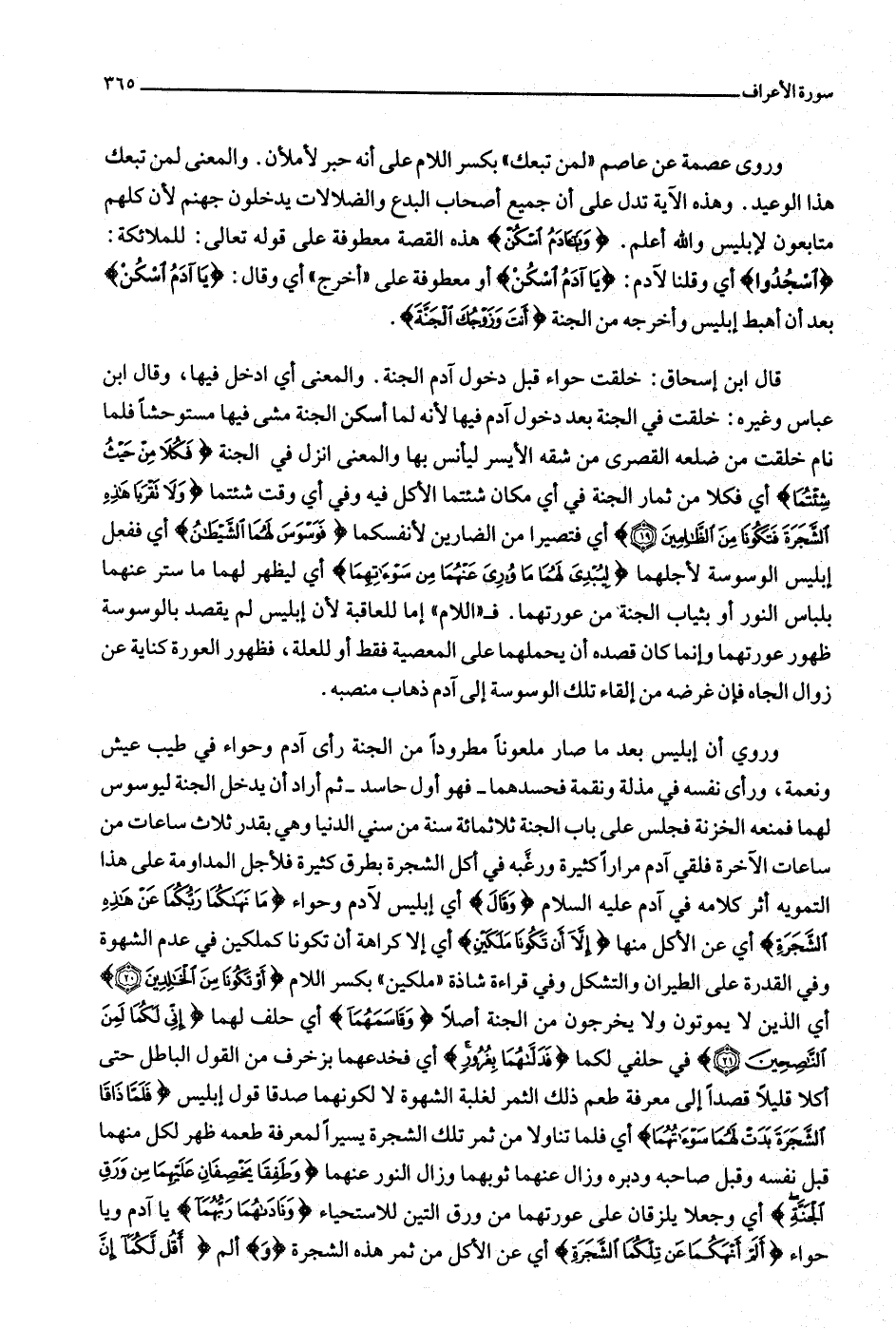 قال ابن إسحاق: خلقت حواء قبل دخول آدم الجنة. والمعنى أي ادخل فيها، وقال ابن عباس وغيره: خلقت في الجنة بعد دخول آدم فيها لأنه لما أسكن الجنة مشى فيها مستوحشا فلما نام خلقت من ضلعه القصرى من شقه الأيسر ليأنس بها والمعنى انزل في الجنة فَكُلا مِنْ حَيْثُ شِئْتُما أي فكلا من ثمار الجنة في أي مكان شئتما الأكل فيه وفي أي وقت شئتما وَلا تَقْرَبا هذِهِ الشَّجَرَةَ فَتَكُونا مِنَ الظَّالِمِينَ (19) أي فتصيرا من الضارين لأنفسكما فَوَسْوَسَ لَهُمَا الشَّيْطانُ أي ففعل إبليس الوسوسة لأجلهما لِيُبْدِيَ لَهُما ما وُورِيَ عَنْهُما مِنْ سَوْآتِهِما أي ليظهر لهما ما ستر عنهما بلباس النور أو بثياب الجنة من عورتهما. ف «اللام» إما للعاقبة لأن إبليس لم يقصد بالوسوسة ظهور عورتهما وإنما كان قصده أن يحملهما على المعصية فقط أو للعلة، فظهور العورة كناية عن زوال الجاه فإن غرضه من إلقاء تلك الوسوسة إلى آدم ذهاب منصبه.