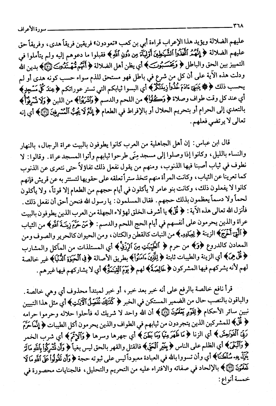 والباقون بالنصب حال من الضمير المستكن في الخبر كَذلِكَ نُفَصِّلُ الْآياتِ أي مثل هذا التبيين نبين سائر الأحكام لِقَوْمٍ يَعْلَمُونَ (32) أن الله واحد لا شريك له فأحلوا حلاله وحرموا حرامه قُلْ للمشركين الذين يتجردون من ثيابهم في الطواف والذين يحرمون أكل الطيبات إِنَّما حَرَّمَ رَبِّيَ الْفَواحِشَ أي الزنا ما ظَهَرَ مِنْها وَما بَطَنَ أي جهرها وسرها وَالْإِثْمَ أي شرب الخمر وَالْبَغْيَ أي الظلم على الناس بِغَيْرِ الْحَقِّ فالقتل والقهر بالحق ليس بغيا وَأَنْ تُشْرِكُوا بِاللَّهِ ما لَمْ يُنَزِّلْ بِهِ سُلْطاناً أي وأن تسووا بالله في العبادة معبودا ليس على ثبوته حجة وَأَنْ تَقُولُوا عَلَى اللَّهِ ما لا تَعْلَمُونَ (33) بالإلحاد في صفاته والافتراء عليه من التحريم والتحليل، فالجنايات محصورة في خمسة أنواع: