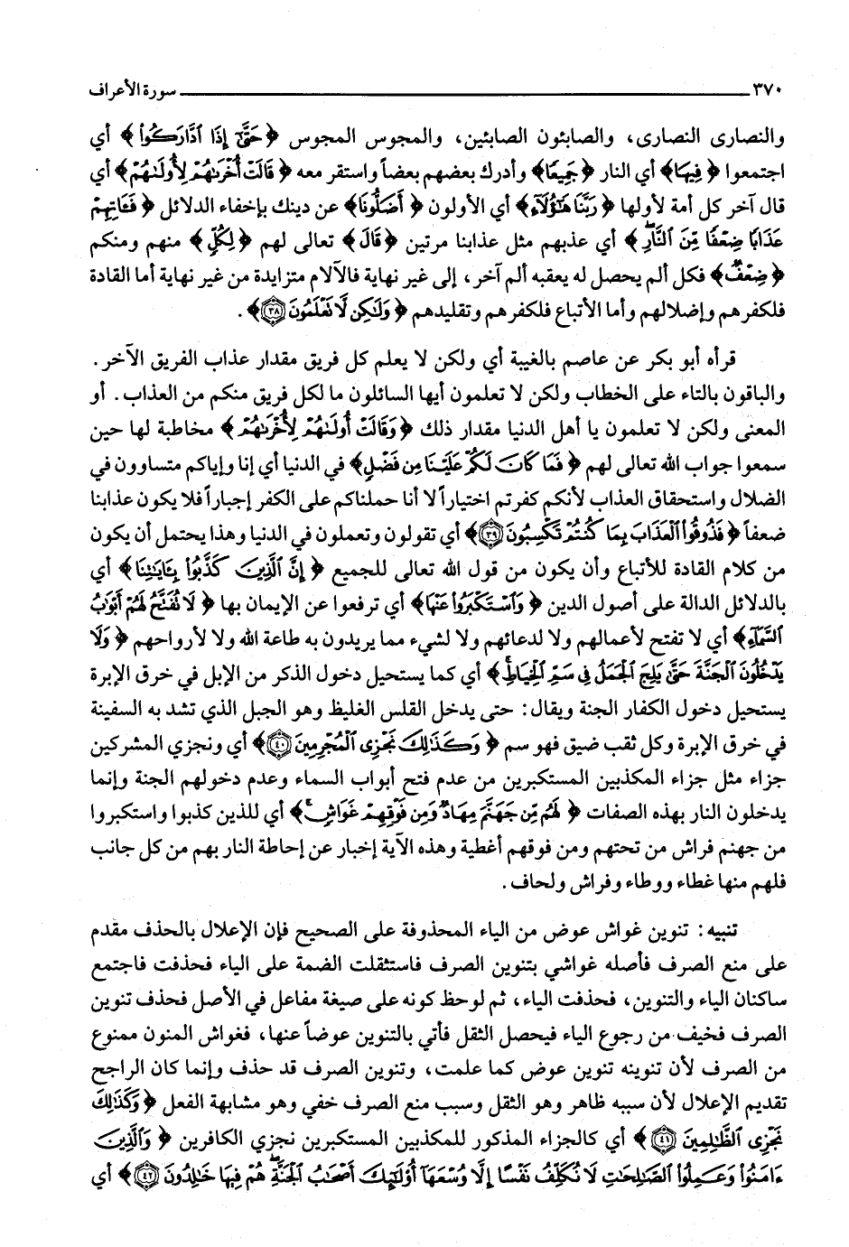 تنبيه: تنوين غواش عوض من الياء المحذوفة على الصحيح فإن الإعلال بالحذف مقدم على منع الصرف فأصله غواشي بتنوين الصرف فاستثقلت الضمة على الياء فحذفت فاجتمع ساكنان الياء والتنوين، فحذفت الياء، ثم لوحظ كونه على صيغة مفاعل في الأصل فحذف تنوين الصرف فخيف من رجوع الياء فيحصل الثقل فأتي بالتنوين عوضا عنها، فغواش المنون ممنوع من الصرف لأن تنوينه تنوين عوض كما علمت، وتنوين الصرف قد حذف وإنما كان الراجح تقديم الإعلال لأن سببه ظاهر وهو الثقل وسبب منع الصرف خفي وهو مشابهة الفعل وَكَذلِكَ نَجْزِي الظَّالِمِينَ (41) أي كالجزاء المذكور للمكذبين المستكبرين نجزي الكافرين وَالَّذِينَ آمَنُوا وَعَمِلُوا الصَّالِحاتِ لا نُكَلِّفُ نَفْساً إِلَّا وُسْعَها أُولئِكَ أَصْحابُ الْجَنَّةِ هُمْ فِيها خالِدُونَ (42) أي