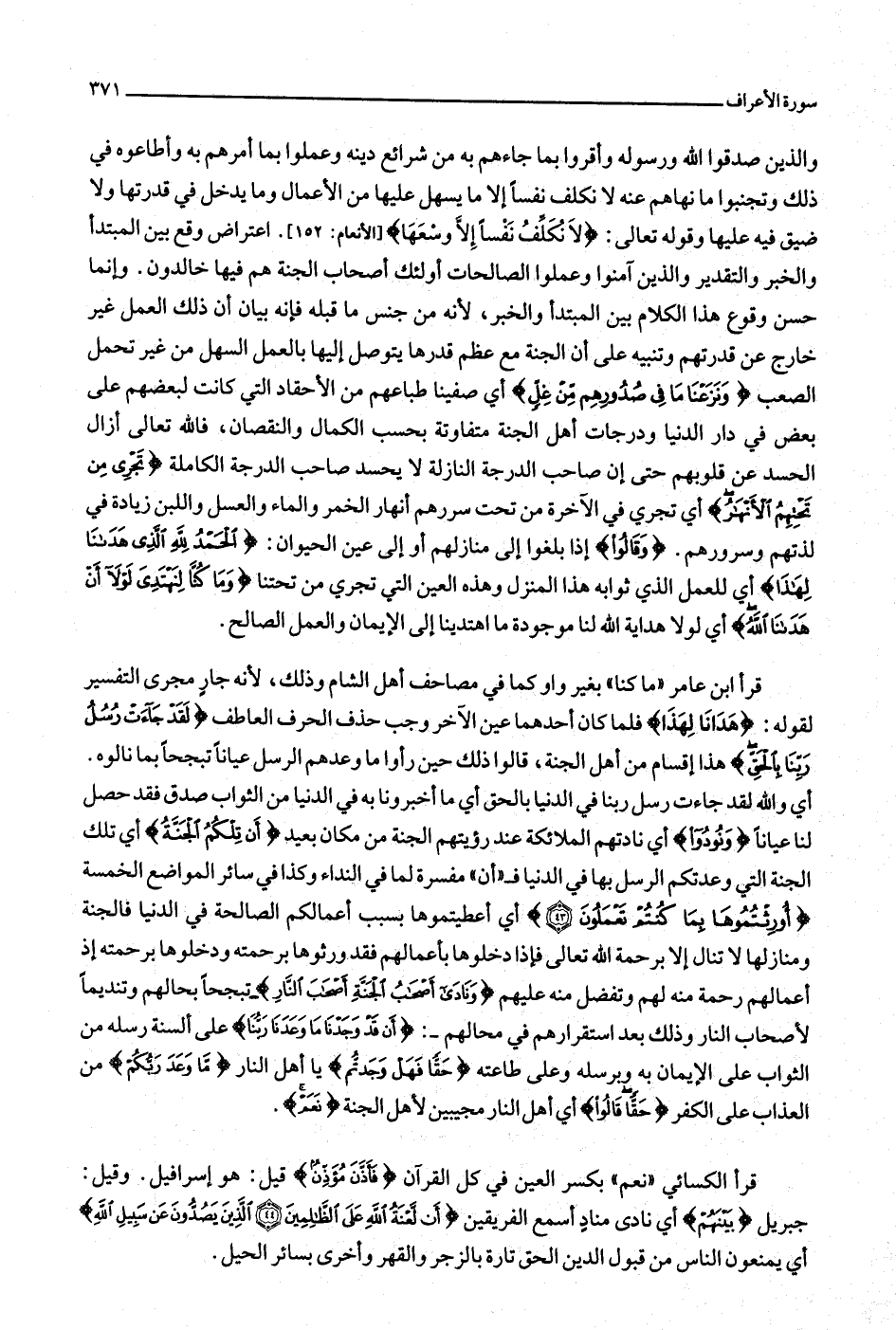 والذين صدقوا الله ورسوله وأقروا بما جاءهم به من شرائع دينه وعملوا بما أمرهم به وأطاعوه في ذلك وتجنبوا ما نهاهم عنه لا نكلف نفسا إلا ما يسهل عليها من الأعمال وما يدخل في قدرتها ولا ضيق فيه عليها وقوله تعالى: لا نُكَلِّفُ نَفْساً إِلَّا وُسْعَها [الأنعام: 152] . اعتراض وقع بين المبتدأ والخبر والتقدير والذين آمنوا وعملوا الصالحات أولئك أصحاب الجنة هم فيها خالدون. وإنما حسن وقوع هذا الكلام بين المبتدأ والخبر، لأنه من جنس ما قبله فإنه بيان أن ذلك العمل غير خارج عن قدرتهم وتنبيه على أن الجنة مع عظم قدرها يتوصل إليها بالعمل السهل من غير تحمل الصعب وَنَزَعْنا ما فِي صُدُورِهِمْ مِنْ غِلٍّ أي صفينا طباعهم من الأحقاد التي كانت لبعضهم على بعض في دار الدنيا ودرجات أهل الجنة متفاوتة بحسب الكمال والنقصان، فالله تعالى أزال الحسد عن قلوبهم حتى إن صاحب الدرجة النازلة لا يحسد صاحب الدرجة الكاملة تَجْرِي مِنْ تَحْتِهِمُ الْأَنْهارُ أي تجري في الآخرة من تحت سررهم أنهار الخمر والماء والعسل واللبن زيادة في لذتهم وسرورهم. وَقالُوا إذا بلغوا إلى منازلهم أو إلى عين الحيوان: الْحَمْدُ لِلَّهِ الَّذِي هَدانا لِهذا أي للعمل الذي ثوابه هذا المنزل وهذه العين التي تجري من تحتنا وَما كُنَّا لِنَهْتَدِيَ لَوْلا أَنْ هَدانَا اللَّهُ أي لولا هداية الله لنا موجودة ما اهتدينا إلى الإيمان والعمل الصالح.