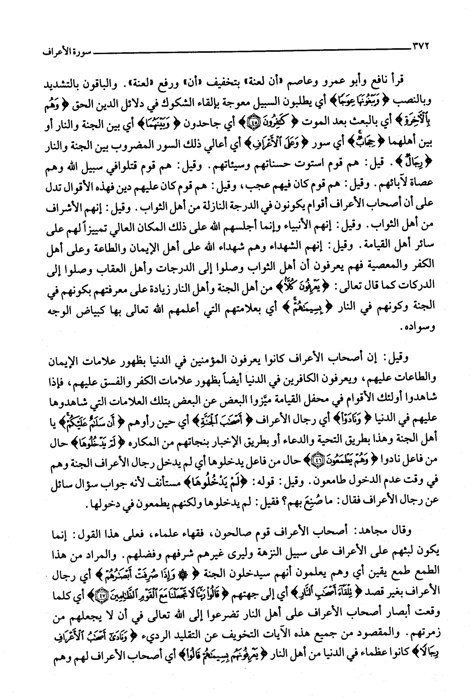 قرأ نافع وأبو عمرو وعاصم «أن لعنة» بتخفيف «أن» ورفع «لعنة» . والباقون بالتشديد وبالنصب وَيَبْغُونَها عِوَجاً أي يطلبون السبيل معوجة بإلقاء الشكوك في دلائل الدين الحق وَهُمْ بِالْآخِرَةِ أي بالبعث بعد الموت كافِرُونَ (45) أي جاحدون وَبَيْنَهُما أي بين الجنة والنار أو بين أهلهما حِجابٌ أي سور وَعَلَى الْأَعْرافِ أي أعالي ذلك السور المضروب بين الجنة والنار رِجالٌ. قيل: هم قوم استوت حسناتهم وسيئاتهم. وقيل: هم قوم قتلوا في سبيل الله وهم عصاة لآبائهم. وقيل: هم قوم كان فيهم عجب، وقيل: هم قوم كان عليهم دين فهذه الأقوال تدل على أن أصحاب الأعراف أقوام يكونون في الدرجة النازلة من أهل الثواب. وقيل: إنهم الأشراف من أهل الثواب. وقيل: إنهم الأنبياء وإنما أجلسهم الله على ذلك المكان العالي تمييزا لهم على سائر أهل القيامة. وقيل: إنهم الشهداء وهم شهداء الله على أهل الإيمان والطاعة وعلى أهل الكفر والمعصية فهم يعرفون أن أهل الثواب وصلوا إلى الدرجات وأهل العقاب وصلوا إلى الدركات كما قال تعالى: يَعْرِفُونَ كُلًّا من أهل الجنة وأهل النار زيادة على معرفتهم بكونهم في الجنة وكونهم في النار بِسِيماهُمْ أي بعلامتهم التي أعلمهم الله تعالى بها كبياض الوجه وسواده.