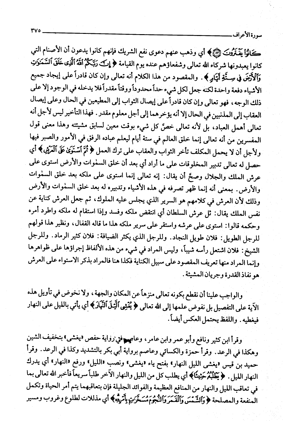 والواجب علينا أن نقطع بكونه تعالى منزها عن المكان والجهة، ولا نخوض في تأويل هذه الآية على التفصيل بل نفوض علمها إلى الله تعالى يُغْشِي اللَّيْلَ النَّهارَ أي يأتي بالليل على النهار فيغطيه. واللفظ يحتمل العكس أيضا.
