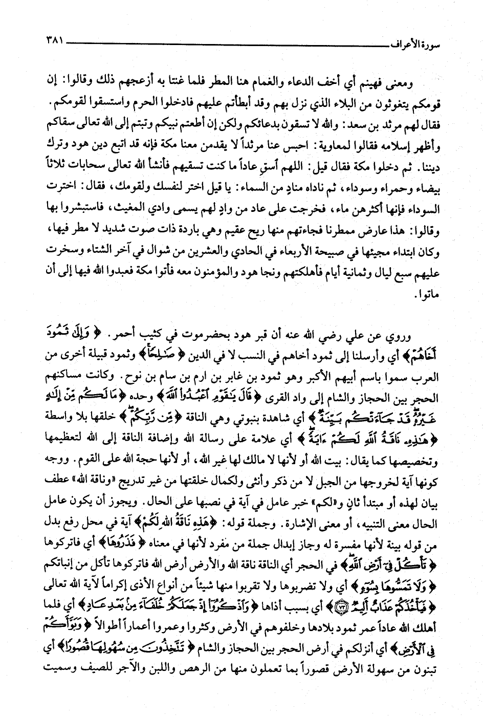 وَإِلى ثَمُودَ أَخاهُمْ أي وأرسلنا إلى ثمود أخاهم في النسب لا في الدين صالِحاً وثمود قبيلة أخرى من العرب سموا باسم أبيهم الأكبر وهو ثمود بن غابر بن ارم بن سام بن نوح. وكانت مساكنهم الحجر بين الحجاز والشام إلى واد القرى قالَ يا قَوْمِ اعْبُدُوا اللَّهَ وحده ما لَكُمْ مِنْ إِلهٍ غَيْرُهُ قَدْ جاءَتْكُمْ بَيِّنَةٌ أي شاهدة بنبوتي وهي الناقة مِنْ رَبِّكُمْ خلقها بلا واسطة هذِهِ ناقَةُ اللَّهِ لَكُمْ آيَةً أي علامة على رسالة الله وإضافة الناقة إلى الله لتعظيمها وتخصيصها كما يقال: بيت الله أو لأنها لا مالك لها غير الله، أو لأنها حجة الله على القوم. ووجه كونها آية لخروجها من الجبل لا من ذكر وأنثى ولكمال خلقتها من غير تدريج «وناقة الله» عطف بيان لهذه أو مبتدأ ثان و «لكم» خبر عامل في آية في نصبها على الحال. ويجوز أن يكون عامل الحال معنى التنبيه، أو معنى الإشارة. وجملة قوله: هذِهِ ناقَةُ اللَّهِ لَكُمْ آية في محل رفع بدل من قوله بينة لأنها مفسرة له وجاز إبدال جملة من مفرد لأنها في معناه فَذَرُوها أي فاتركوها تَأْكُلْ فِي أَرْضِ اللَّهِ في الحجر أي الناقة ناقة الله والأرض أرض الله فاتركوها تأكل من إنباتكم وَلا تَمَسُّوها بِسُوءٍ أي ولا تضربوها ولا تقربوا منها شيئا من أنواع الأذى إكراما لآية الله تعالى فَيَأْخُذَكُمْ عَذابٌ أَلِيمٌ (73) أي بسبب أذاها وَاذْكُرُوا إِذْ جَعَلَكُمْ خُلَفاءَ مِنْ بَعْدِ عادٍ أي فلما أهلك الله عادا عمر ثمود بلادها وخلفوهم في الأرض وكثروا وعمروا أعمارا أطوالا وَبَوَّأَكُمْ فِي الْأَرْضِ أي أنزلكم في أرض الحجر بين الحجاز والشام تَتَّخِذُونَ مِنْ سُهُولِها قُصُوراً أي تبنون من سهولة الأرض قصورا بما تعملون منها من الرهص واللبن والآجر للصيف وسميت