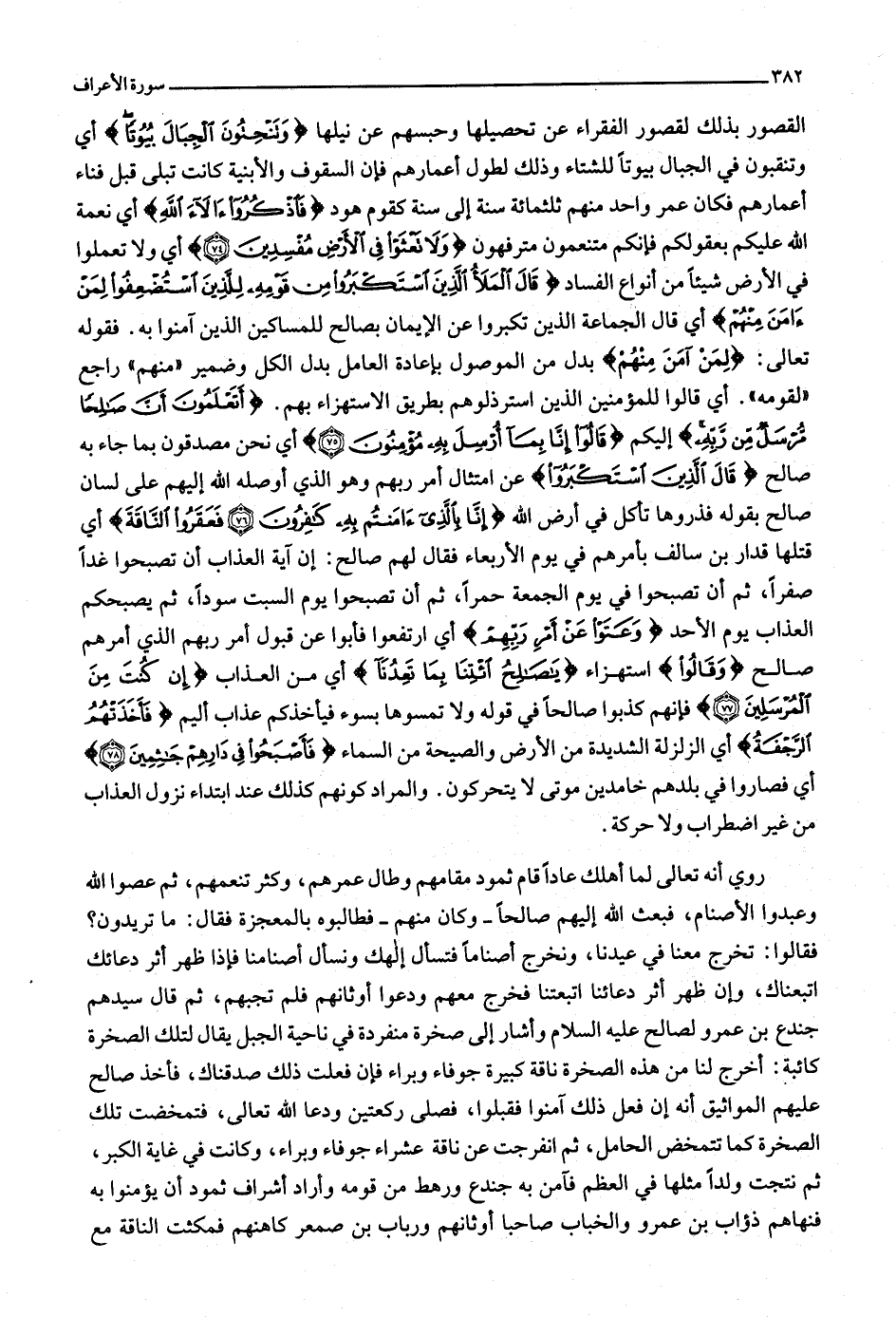 القصور بذلك لقصور الفقراء عن تحصيلها وحبسهم عن نيلها وَتَنْحِتُونَ الْجِبالَ بُيُوتاً أي وتنقبون في الجبال بيوتا للشتاء وذلك لطول أعمارهم فإن السقوف والأبنية كانت تبلى قبل فناء أعمارهم فكان عمر واحد منهم ثلاثمائة سنة إلى سنة كقوم هود فَاذْكُرُوا آلاءَ اللَّهِ أي نعمة الله عليكم بعقولكم فإنكم متنعمون مترفهون وَلا تَعْثَوْا فِي الْأَرْضِ مُفْسِدِينَ (74) أي ولا تعملوا في الأرض شيئا من أنواع الفساد قالَ الْمَلَأُ الَّذِينَ اسْتَكْبَرُوا مِنْ قَوْمِهِ لِلَّذِينَ اسْتُضْعِفُوا لِمَنْ آمَنَ مِنْهُمْ أي قال الجماعة الذين تكبروا عن الإيمان بصالح للمساكين الذين آمنوا به. فقوله تعالى: لِمَنْ آمَنَ مِنْهُمْ بدل من الموصول بإعادة العامل بدل الكل وضمير «منهم» راجع «لقومه» . أي قالوا للمؤمنين الذين استرذلوهم بطريق الاستهزاء بهم. أَتَعْلَمُونَ أَنَّ صالِحاً مُرْسَلٌ مِنْ رَبِّهِ إليكم قالُوا إِنَّا بِما أُرْسِلَ بِهِ مُؤْمِنُونَ (75) أي نحن مصدقون بما جاء به صالح قالَ الَّذِينَ اسْتَكْبَرُوا عن امتثال أمر ربهم وهو الذي أوصله الله إليهم على لسان صالح بقوله فذروها تأكل في أرض الله إِنَّا بِالَّذِي آمَنْتُمْ بِهِ كافِرُونَ (76) فَعَقَرُوا النَّاقَةَ أي قتلها قدار بن سالف بأمرهم في يوم الأربعاء فقال لهم صالح: إن آية العذاب أن تصبحوا غدا صفرا، ثم أن تصبحوا في يوم الجمعة حمرا، ثم أن تصبحوا يوم السبت سودا، ثم يصبحكم العذاب يوم الأحد وَعَتَوْا عَنْ أَمْرِ رَبِّهِمْ أي ارتفعوا فأبوا عن قبول أمر ربهم الذي أمرهم صالح وَقالُوا استهزاء يا صالِحُ ائْتِنا بِما تَعِدُنا أي من العذاب إِنْ كُنْتَ مِنَ الْمُرْسَلِينَ (77) فإنهم كذبوا صالحا في قوله ولا تمسوها بسوء فيأخذكم عذاب أليم فَأَخَذَتْهُمُ الرَّجْفَةُ أي الزلزلة الشديدة من الأرض والصيحة من السماء فَأَصْبَحُوا فِي دارِهِمْ جاثِمِينَ (78) أي فصاروا في بلدهم خامدين موتى لا يتحركون. والمراد كونهم كذلك عند ابتداء نزول العذاب من غير اضطراب ولا حركة.