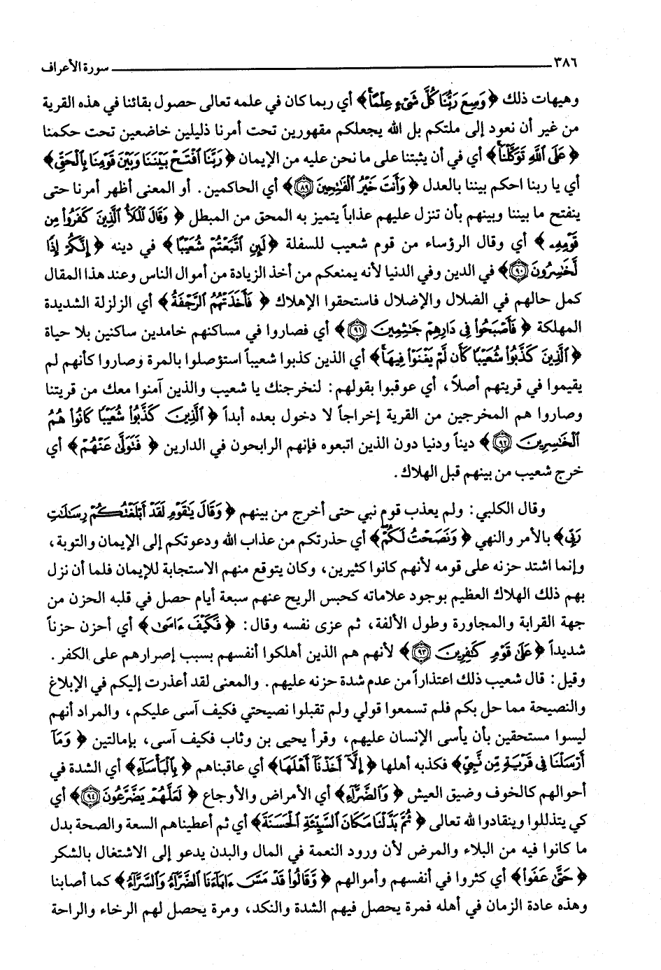 وقال الكلبي: ولم يعذب قوم نبي حتى أخرج من بينهم وَقالَ يا قَوْمِ لَقَدْ أَبْلَغْتُكُمْ رِسالاتِ رَبِّي بالأمر والنهي وَنَصَحْتُ لَكُمْ أي حذرتكم من عذاب الله ودعوتكم إلى الإيمان والتوبة، وإنما اشتد حزنه على قومه لأنهم كانوا كثيرين، وكان يتوقع منهم الاستجابة للإيمان فلما أن نزل بهم ذلك الهلاك العظيم بوجود علاماته كحبس الريح عنهم سبعة أيام حصل في قلبه الحزن من جهة القرابة والمجاورة وطول الألفة، ثم عزى نفسه وقال: فَكَيْفَ آسى أي أحزن حزنا شديدا عَلى قَوْمٍ كافِرِينَ (93) لأنهم هم الذين أهلكوا أنفسهم بسبب إصرارهم على الكفر.