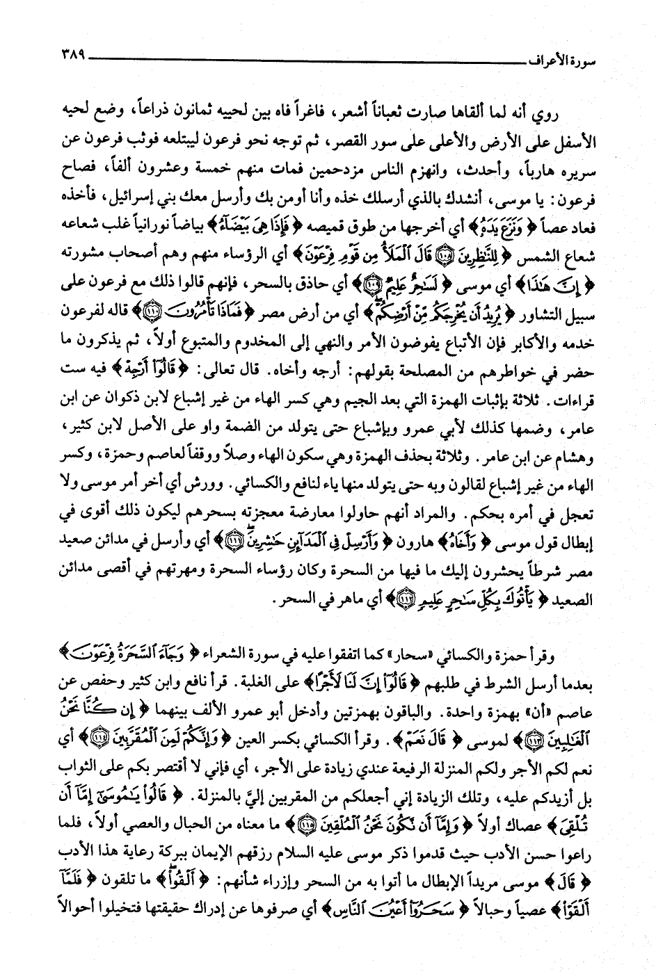 وقرأ حمزة والكسائي «سحار» كما اتفقوا عليه في سورة الشعراء وَجاءَ السَّحَرَةُ فِرْعَوْنَ بعد ما أرسل الشرط في طلبهم قالُوا إِنَّ لَنا لَأَجْراً على الغلبة. قرأ نافع وابن كثير وحفص عن عاصم «أن» بهمزة واحدة. والباقون بهمزتين وأدخل أبو عمرو الألف بينهما إِنْ كُنَّا نَحْنُ الْغالِبِينَ (113) لموسى قالَ نَعَمْ. وقرأ الكسائي بكسر العين وَإِنَّكُمْ لَمِنَ الْمُقَرَّبِينَ (114) أي نعم لكم الأجر ولكم المنزلة الرفيعة عندي زيادة على الأجر، أي فإني لا أقتصر بكم على الثواب بل أزيدكم عليه، وتلك الزيادة إني أجعلكم من المقربين إليّ بالمنزلة. قالُوا يا مُوسى إِمَّا أَنْ تُلْقِيَ عصاك أولا وَإِمَّا أَنْ نَكُونَ نَحْنُ الْمُلْقِينَ (115) ما معناه من الحبال والعصي أولا، فلما راعوا حسن الأدب حيث قدموا ذكر موسى عليه السلام رزقهم الإيمان ببركة رعاية هذا الأدب قالَ موسى مريدا الإبطال ما أتوا به من السحر وإزراء شأنهم: أَلْقُوا ما تلقون فَلَمَّا أَلْقَوْا عصيا وحبالا سَحَرُوا أَعْيُنَ النَّاسِ أي صرفوها عن إدراك حقيقتها فتخيلوا أحوالا