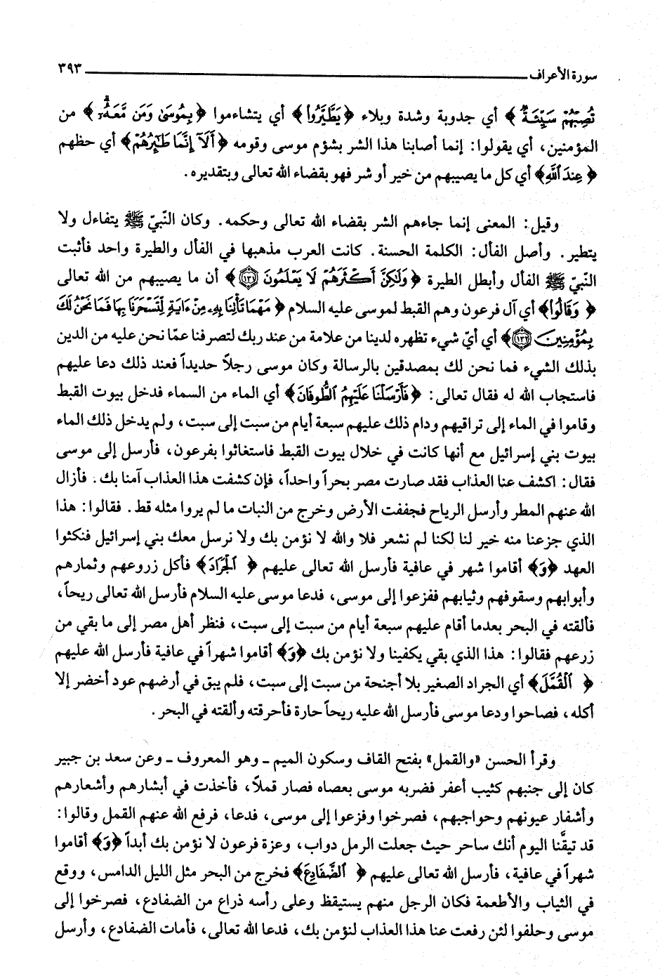 وقرأ الحسن «والقمل» بفتح القاف وسكون الميم- وهو المعروف- وعن سعد بن جبير كان إلى جنبهم كثيب أعفر فضربه موسى بعصاه فصار قملا، فأخذت في أبشارهم وأشعارهم وأشفار عيونهم وحواجبهم، فصرخوا وفزعوا إلى موسى، فدعا، فرفع الله عنهم القمل وقالوا: