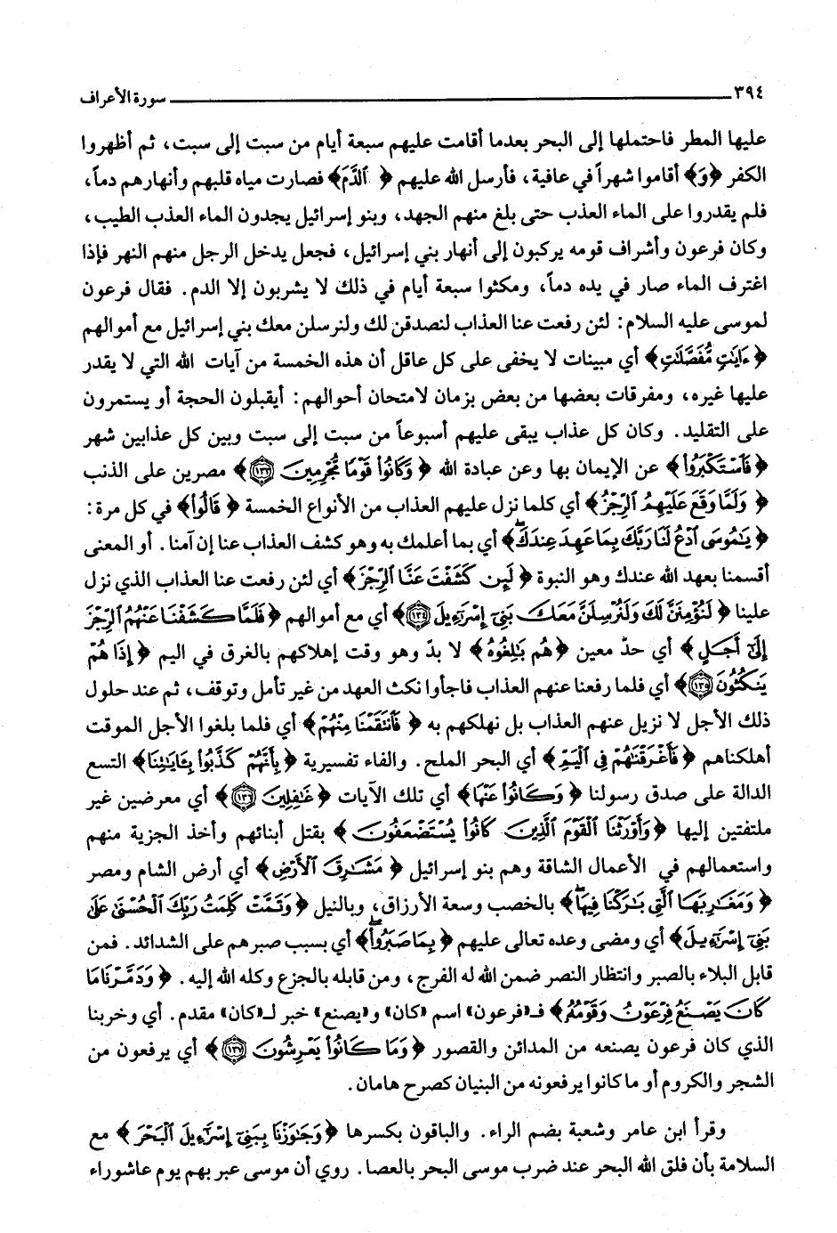 يا مُوسَى ادْعُ لَنا رَبَّكَ بِما عَهِدَ عِنْدَكَ أي بما أعلمك به وهو كشف العذاب عنا إن آمنا. أو المعنى أقسمنا بعهد الله عندك وهو النبوة لَئِنْ كَشَفْتَ عَنَّا الرِّجْزَ أي لئن رفعت عنا العذاب الذي نزل علينا لَنُؤْمِنَنَّ لَكَ وَلَنُرْسِلَنَّ مَعَكَ بَنِي إِسْرائِيلَ (134) أي مع أموالهم فَلَمَّا كَشَفْنا عَنْهُمُ الرِّجْزَ إِلى أَجَلٍ أي حدّ معين هُمْ بالِغُوهُ لا بدّ وهو وقت إهلاكهم بالغرق في اليم إِذا هُمْ يَنْكُثُونَ (135) أي فلما رفعنا عنهم العذاب فاجأوا نكث العهد من غير تأمل وتوقف، ثم عند حلول ذلك الأجل لا نزيل عنهم العذاب بل نهلكهم به فَانْتَقَمْنا مِنْهُمْ أي فلما بلغوا الأجل الموقت أهلكناهم فَأَغْرَقْناهُمْ فِي الْيَمِّ أي البحر الملح. والفاء تفسيرية بِأَنَّهُمْ كَذَّبُوا بِآياتِنا التسع الدالة على صدق رسولنا وَكانُوا عَنْها أي تلك الآيات غافِلِينَ (136) أي معرضين غير ملتفتين إليها وَأَوْرَثْنَا الْقَوْمَ الَّذِينَ كانُوا يُسْتَضْعَفُونَ بقتل أبنائهم وأخذ الجزية منهم واستعمالهم في الأعمال الشاقة وهم بنو إسرائيل مَشارِقَ الْأَرْضِ أي أرض الشام ومصر وَمَغارِبَهَا الَّتِي بارَكْنا فِيها بالخصب وسعة الأرزاق، وبالنيل وَتَمَّتْ كَلِمَتُ رَبِّكَ الْحُسْنى عَلى بَنِي إِسْرائِيلَ أي ومضى وعده تعالى عليهم بِما صَبَرُوا أي بسبب صبرهم على الشدائد. فمن قابل البلاء بالصبر وانتظار النصر ضمن الله له الفرج، ومن قابله بالجزع وكله الله إليه. وَدَمَّرْنا ما كانَ يَصْنَعُ فِرْعَوْنُ وَقَوْمُهُ ف «فرعون» اسم «كان» و «يصنع» خبر ل «كان» مقدم. أي وخربنا الذي كان فرعون يصنعه من المدائن والقصور وَما كانُوا يَعْرِشُونَ (137) أي يرفعون من الشجر والكروم أو ما كانوا يرفعونه من البنيان كصرح هامان.